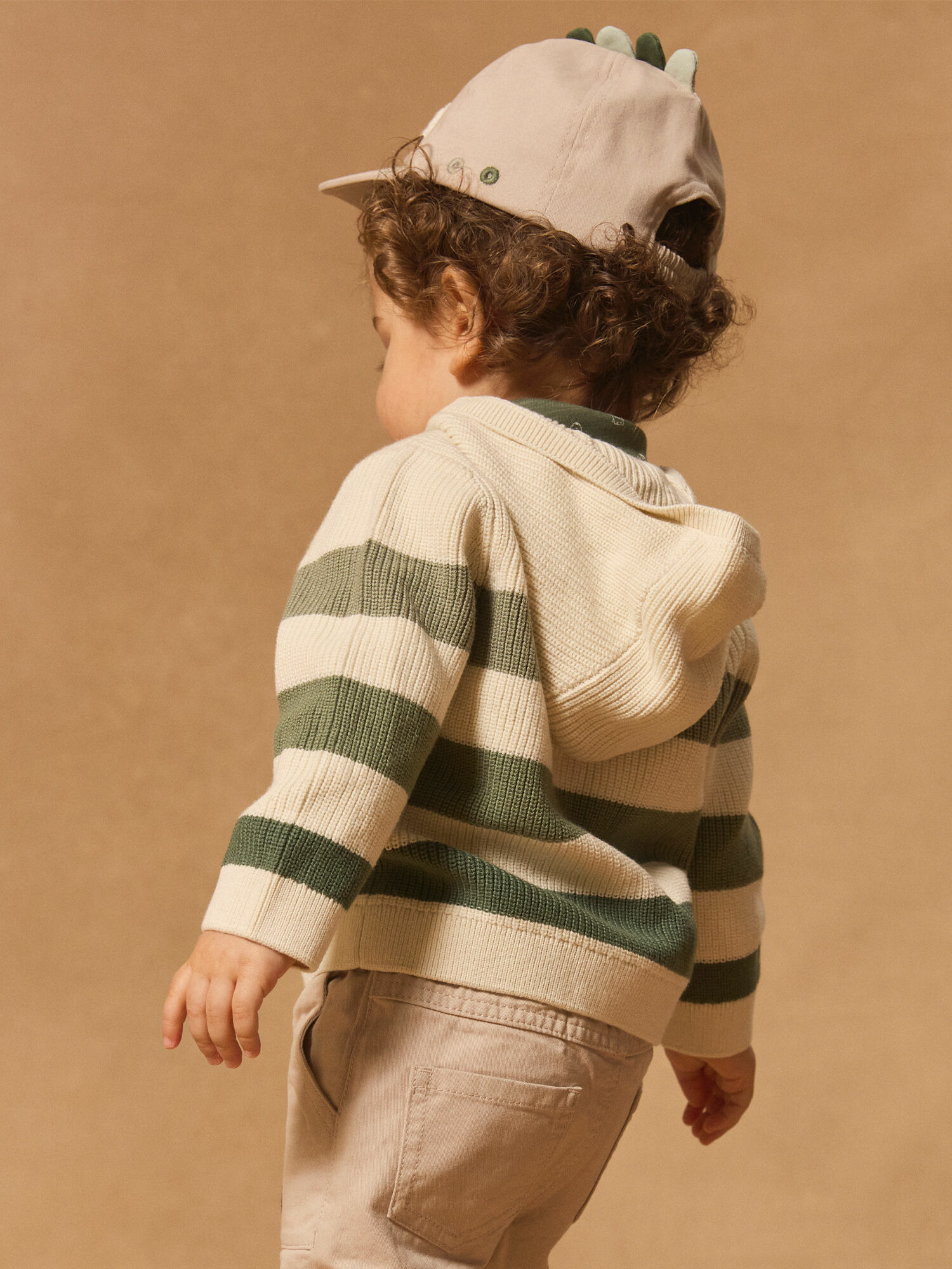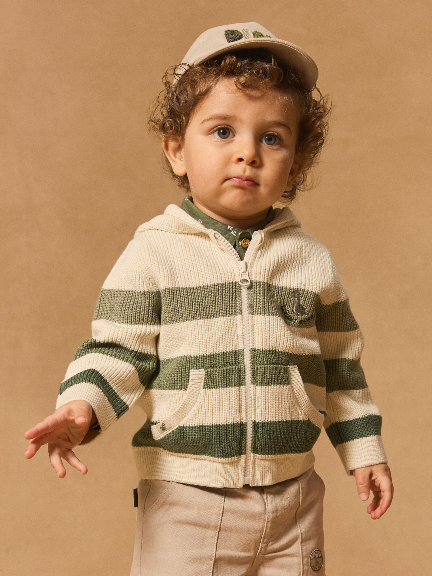 Rayures vert sauge, vert foncé et kaki sur fond écru. Dinosaure brodé sur le buste. Ouverture avant intégrale par fermeture zippée. Poches avant. Ce produit fait partie de la collection Brin de sauge. Pour en savoir plus sur ses qualités environnementales, consultez la fiche produit dédiée.