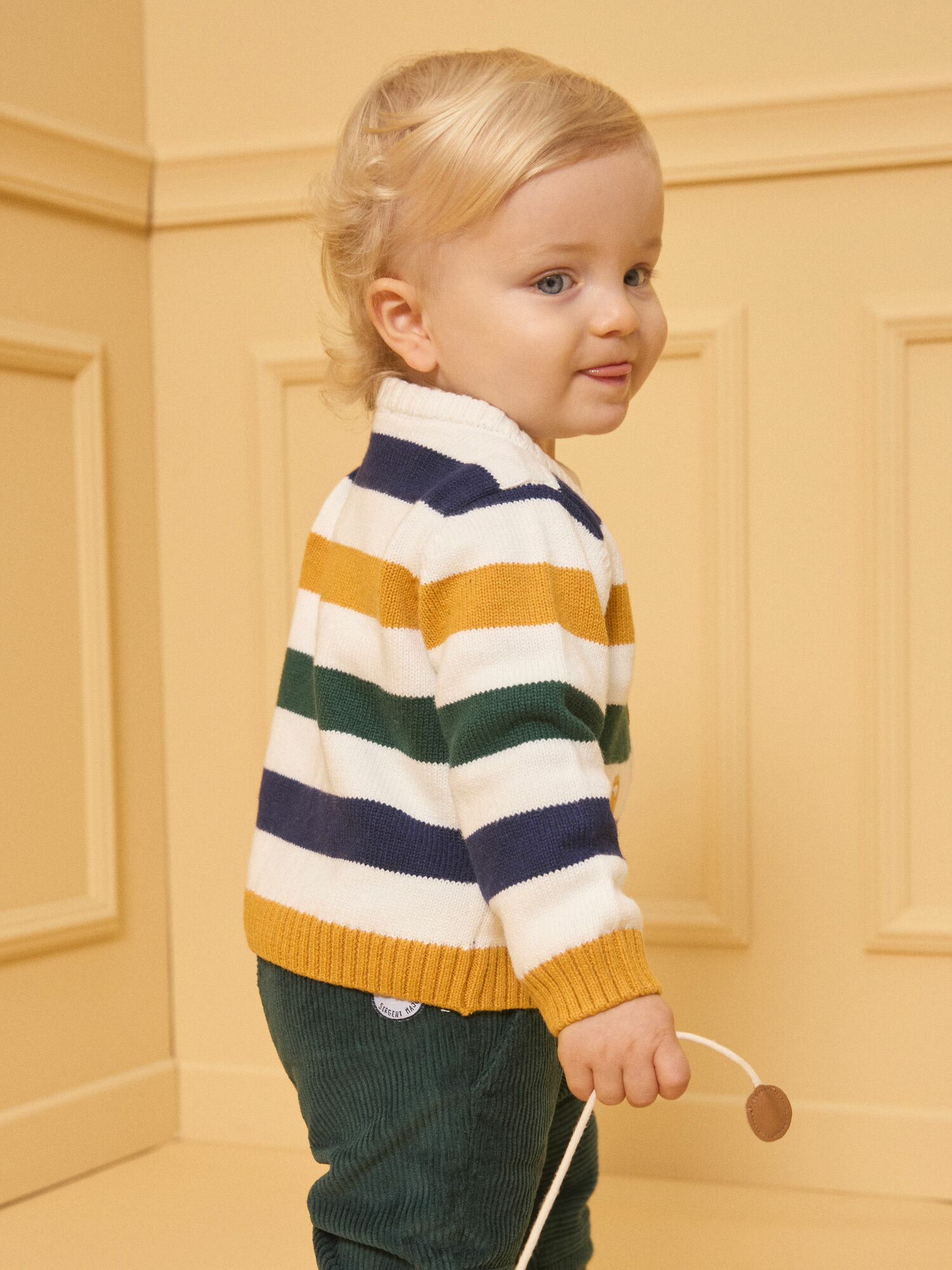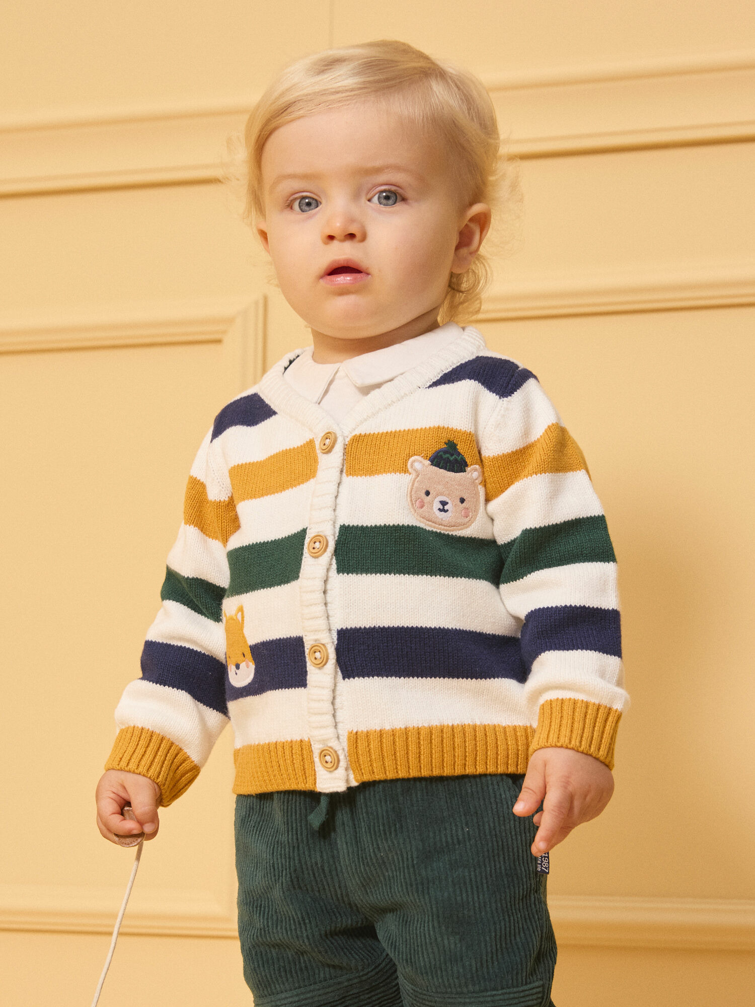 Un gilet qui allie originalité et confort pour les enfants pleins de vie. Les patchs animaux apportent une touche ludique à un classique rayé revisité.