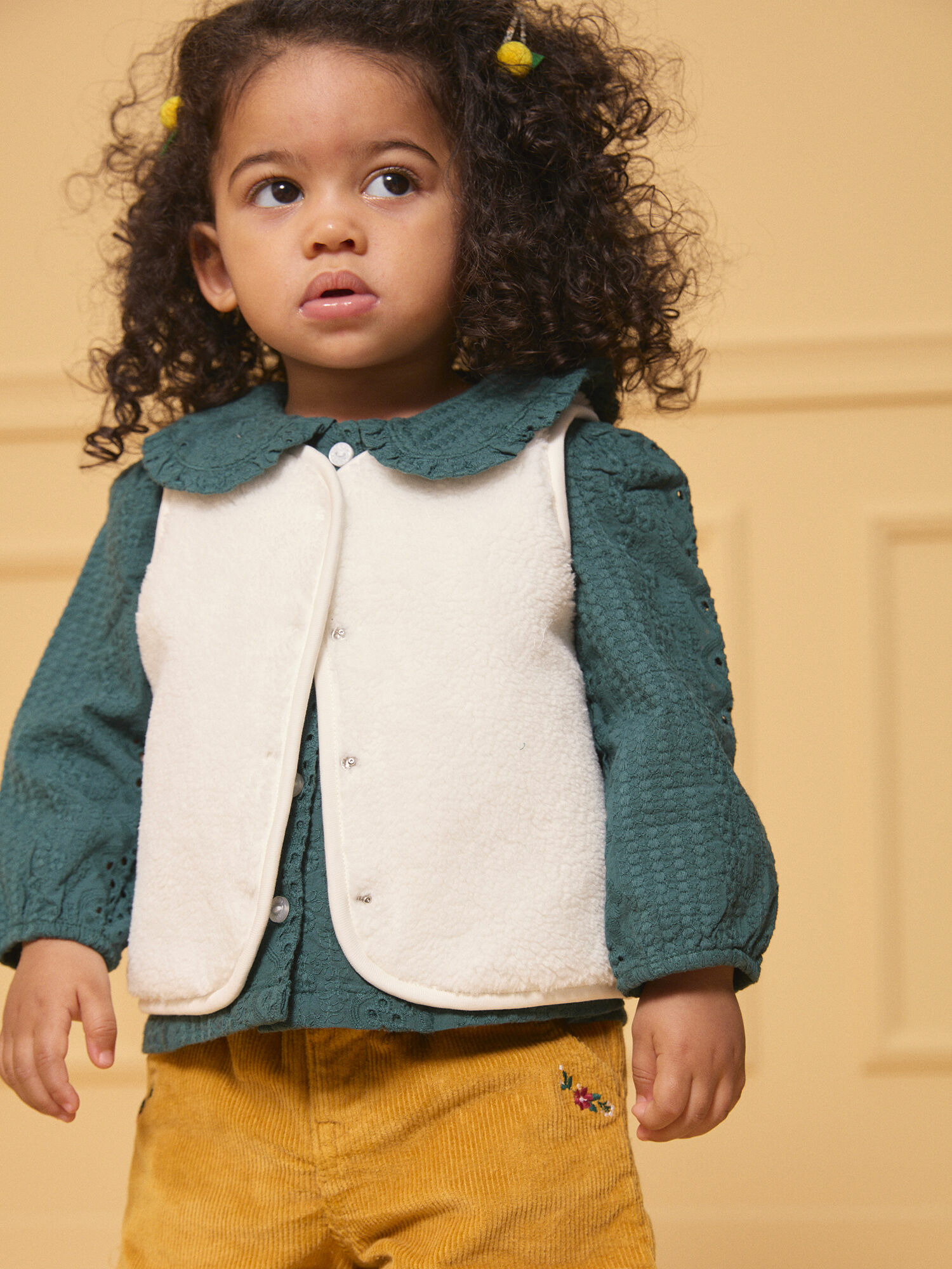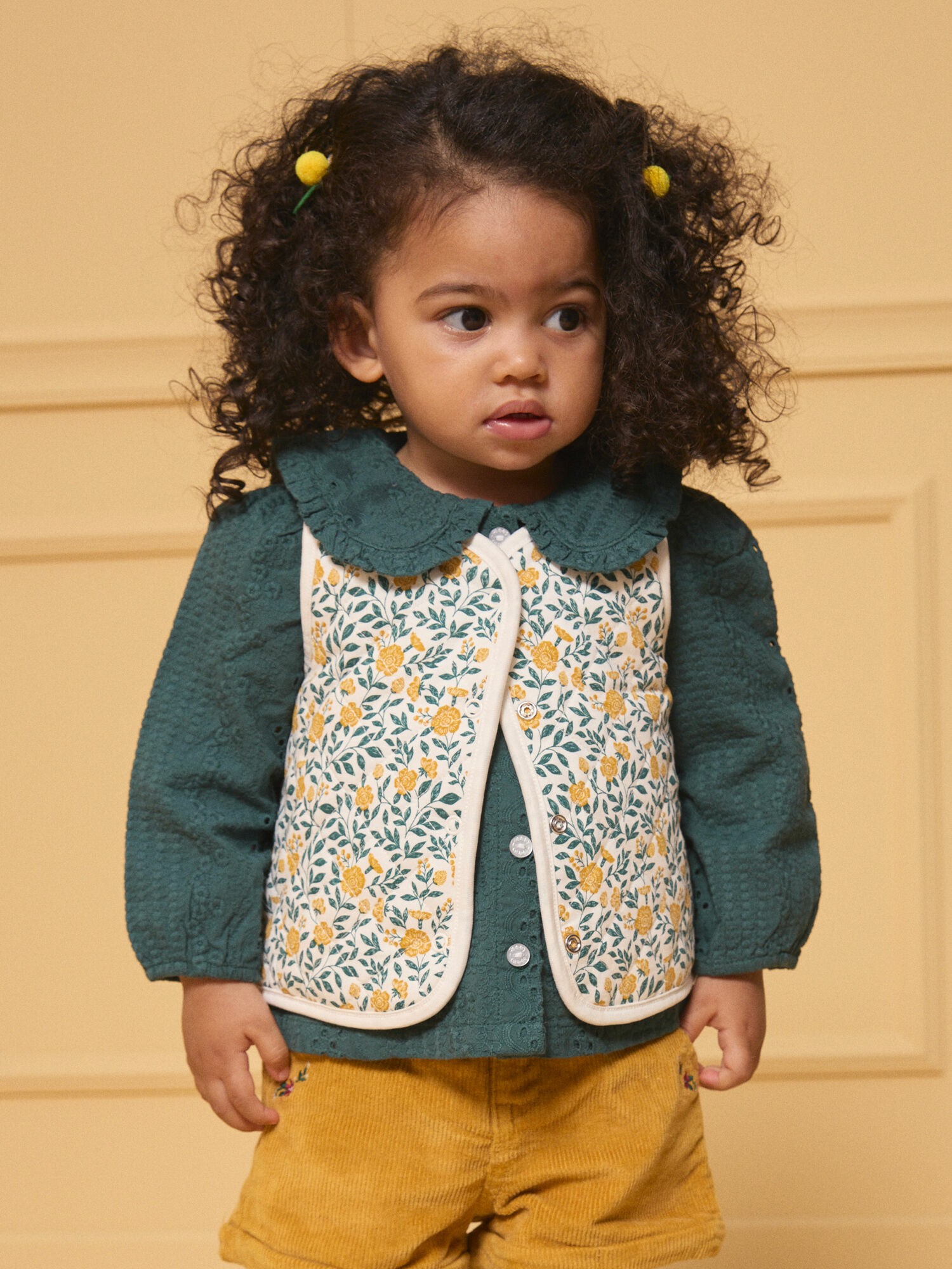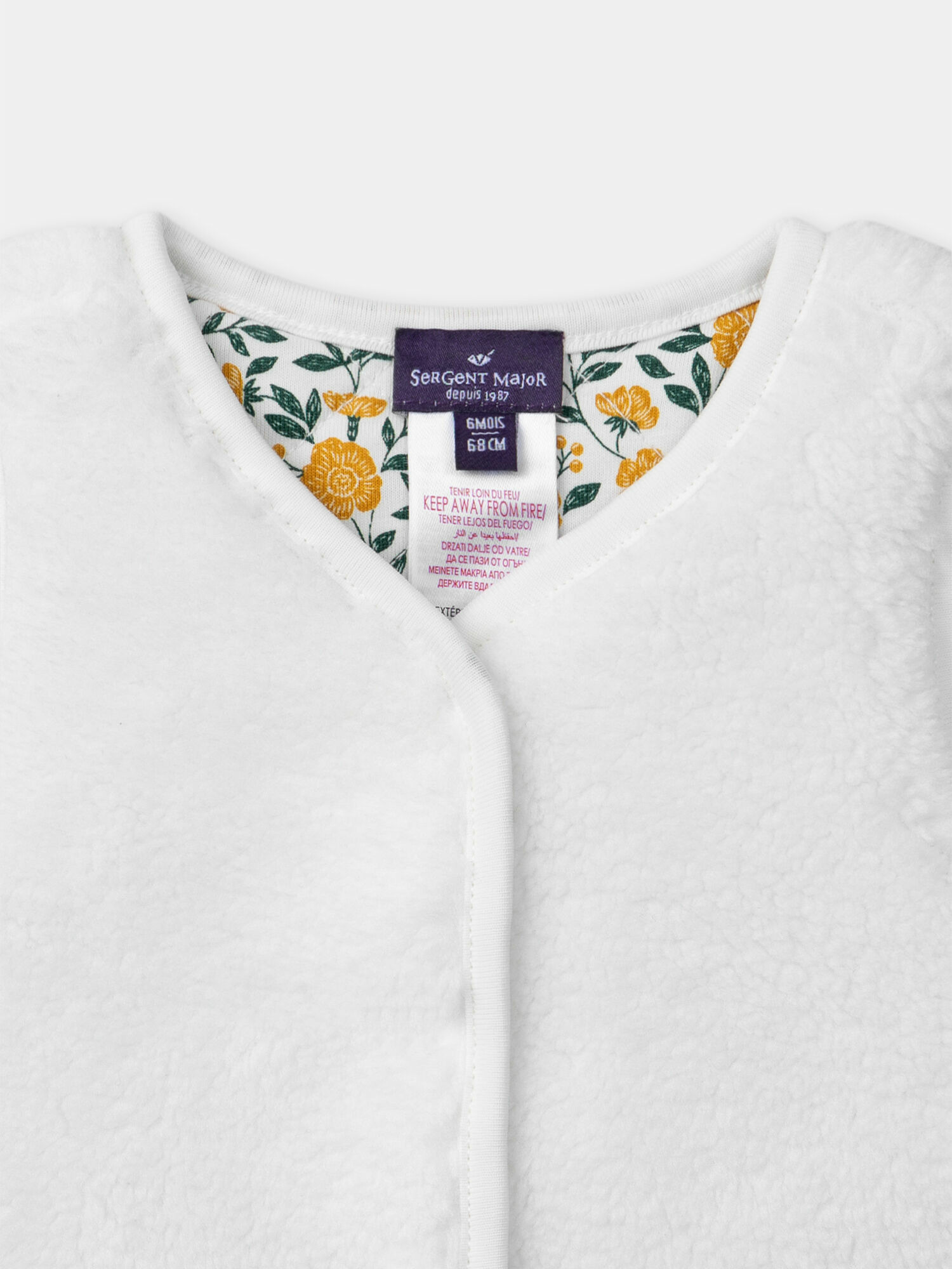 Disponible en taille 6 ans, il fait partie de la Collection Marmelade à Edimbourg, référence LALOLA / 24H1BFO1CSM001. Ouverture avant intégrale par boutons à pression. Face 1 : imprimé matelassé fleuri vert sombre et jaune sur fond écru. Face 2 : unie en fourrure synthétique écrue.