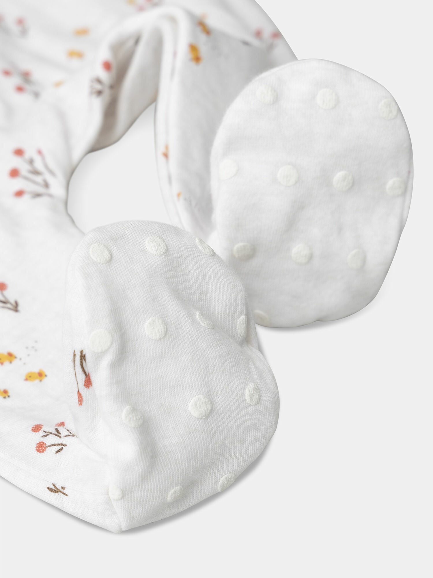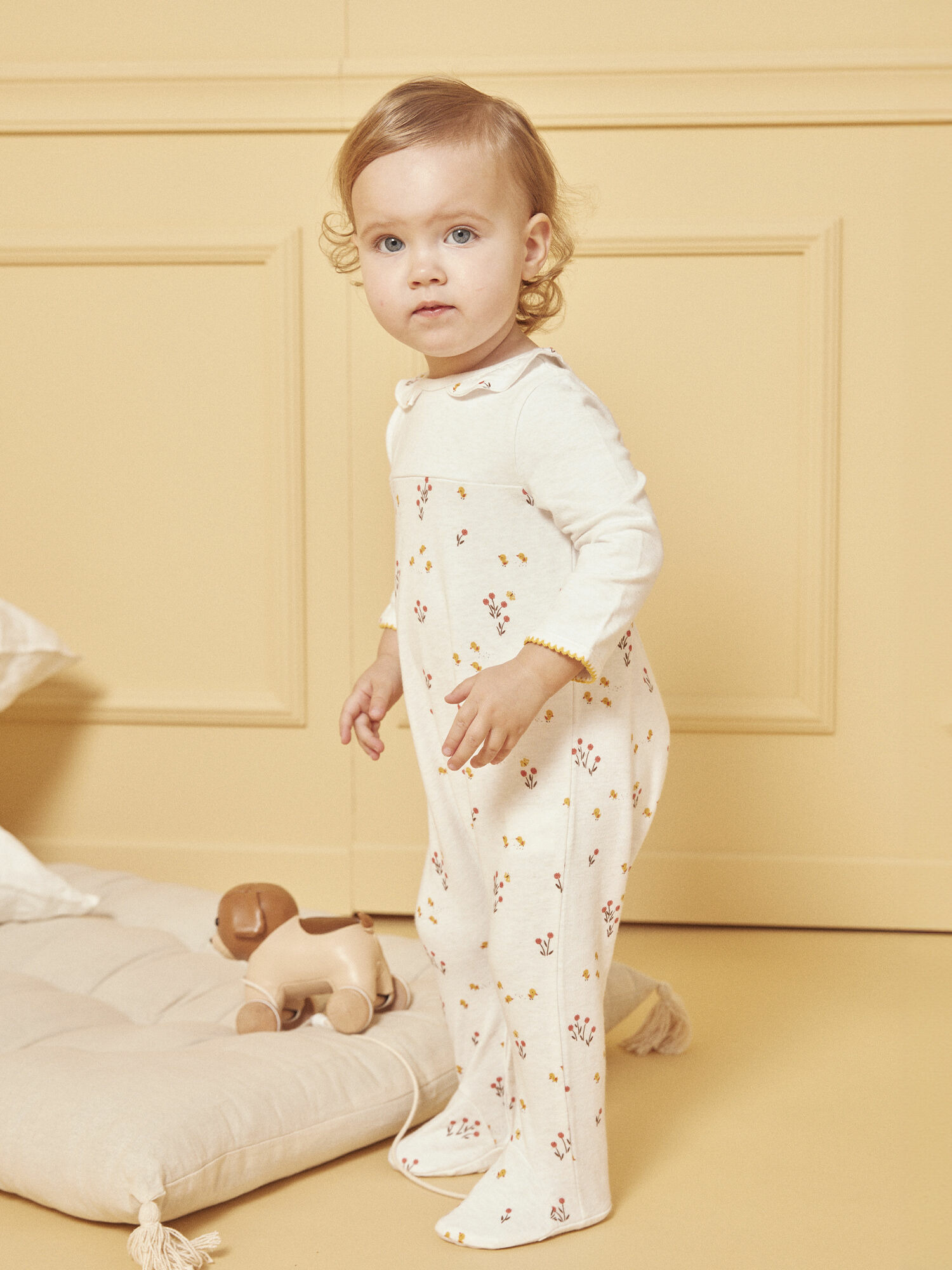 Manches et empiècement supérieur en beige chiné clair uni. Bas du dors-bien, col et bas des manches ornés d’un imprimé petits poussins et fleurs dans les tons jaune poussin, rouge orangé et brun. Finitions picots jaunes sur le bas des manches. Dessous des pieds avec impression en relief en forme de pois écru. Référence produit : LEADELYS / 24H5BF32GRE006. Pour plus d’informations sur les qualités environnementales, consultez la fiche produit dédiée.