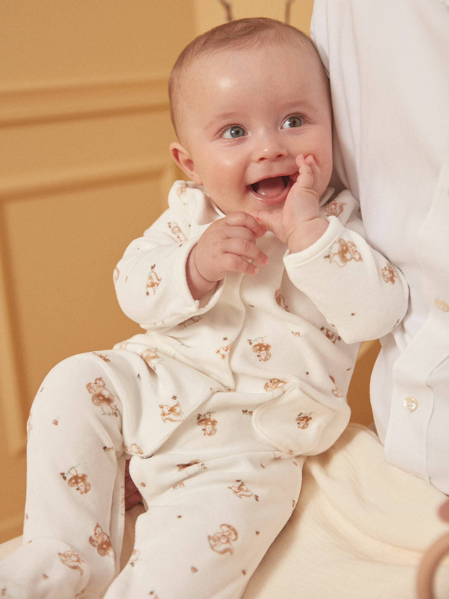 Fabriquée en velours doux, elle présente une ouverture à boutons-pression devant et à l’entrejambe, des pieds intégrés et un imprimé animaux de la forêt. Vendu avec une étiquette cadeau en forme de champignon, ce modèle fait partie de la collection Naissance - Forêt Enchantée.