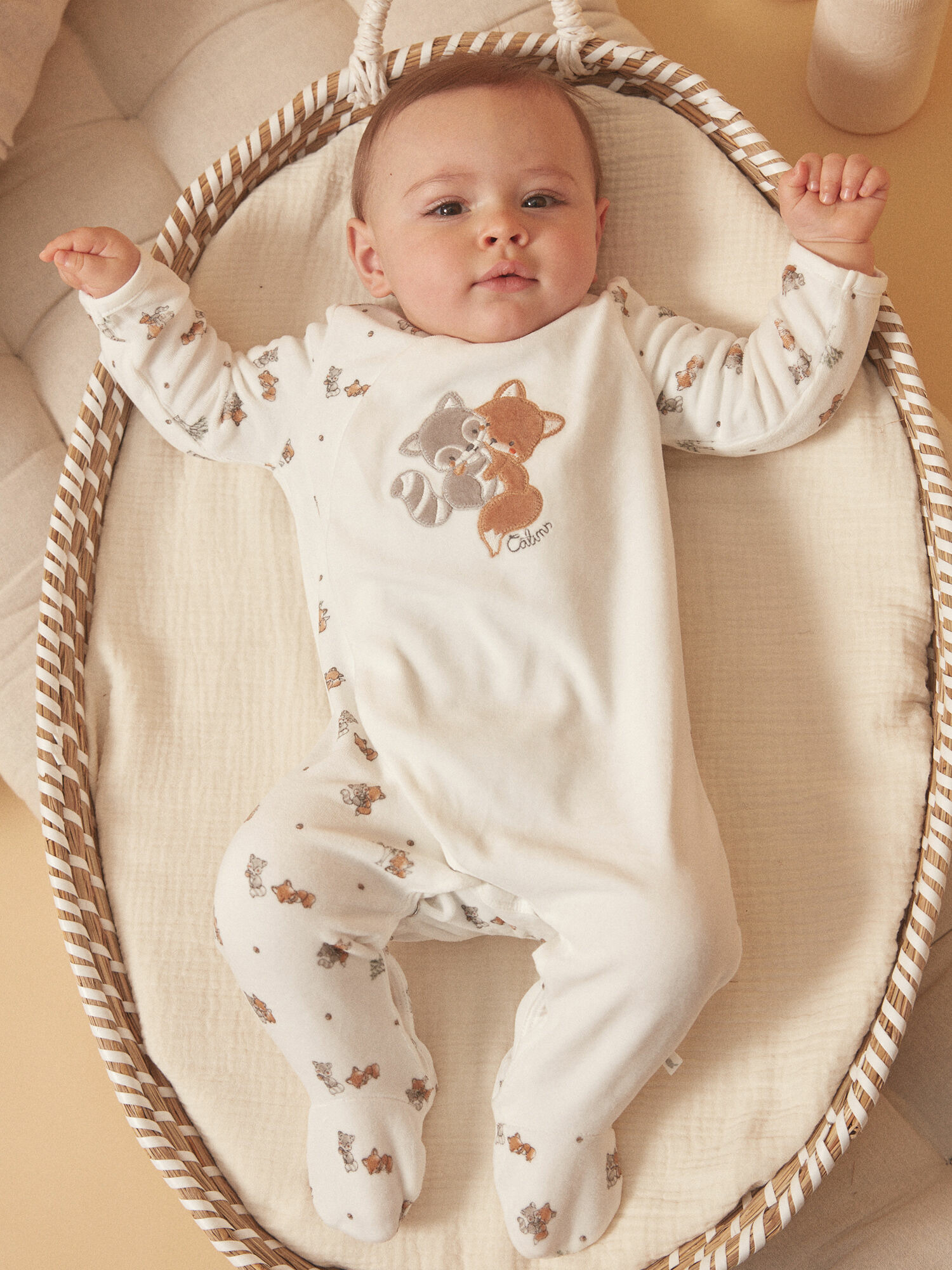 Composition et caractéristiques : grenouillère écrue en velours de coton biologique, col rond, manches longues, pieds intégrés, ouverture à boutons-pression devant, imprimé renard et raton laveur, lettrage « Câlins » sur le devant. Produit de la Collection Naissance - Forêt Enchantée. Référence : LORENS / 24H0NG12GRE001.
