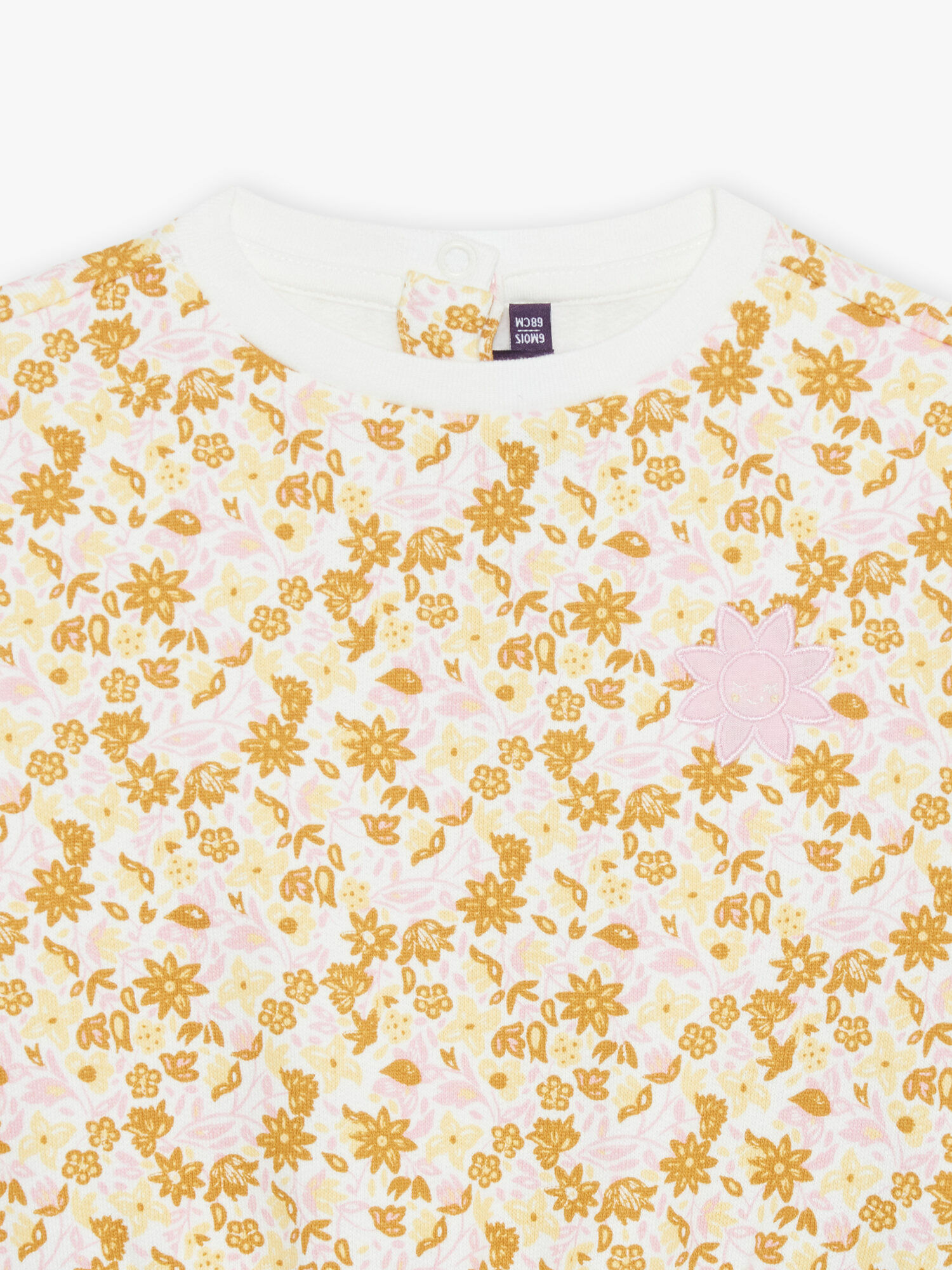 Matière molleton écru, ouverture par boutons-pression au dos, volants sur les épaules, poignets et base resserrés. Motif imprimé fleuri jaune miel avec feuillage bleu ciel, patchs décoratifs fleurs brodés. Produit issu de la collection Le Livre de la Savane.