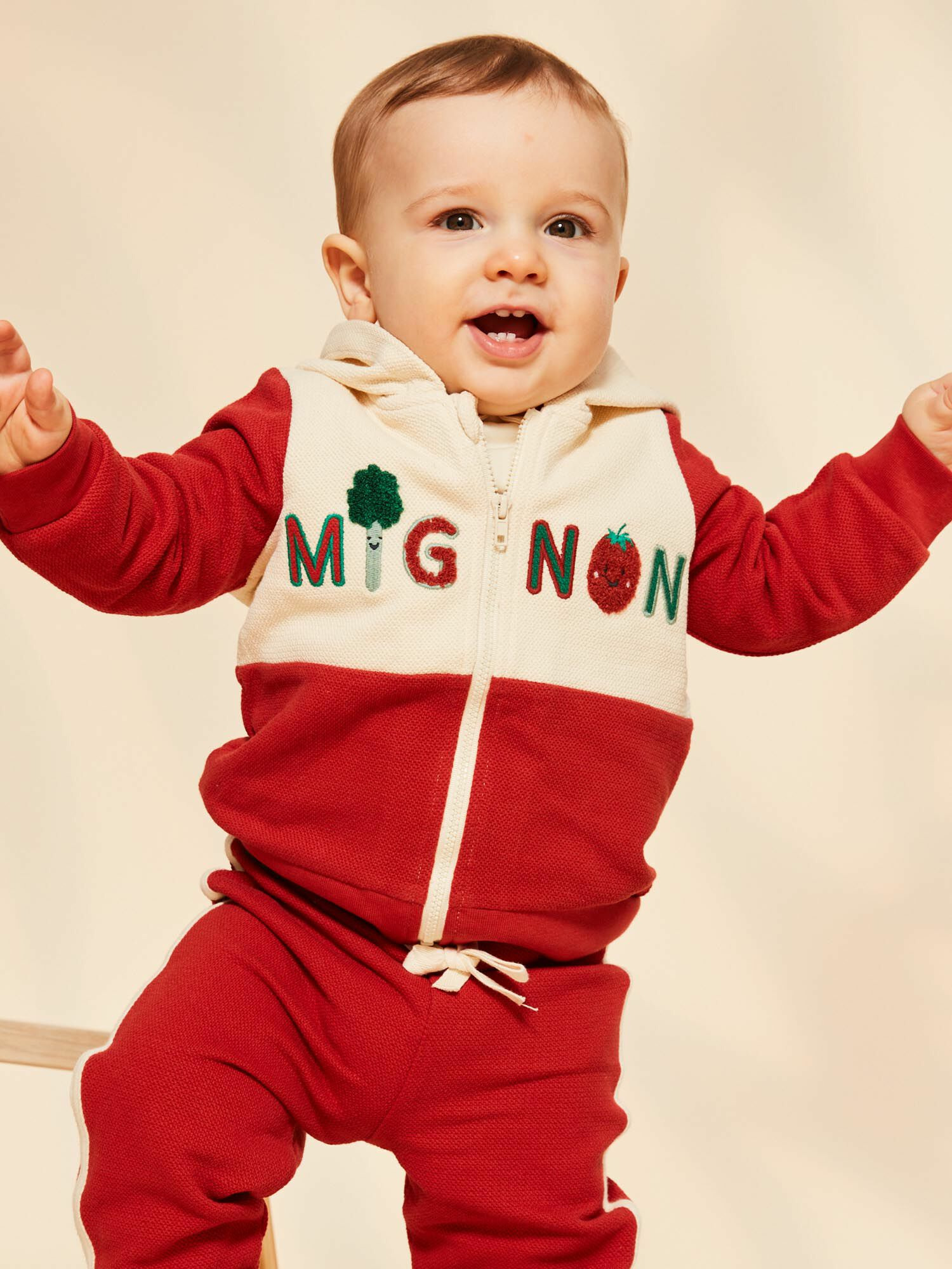 Pensé pour durer, ce haut de jogging offre une douceur naturelle et une respirabilité idéale pour un usage quotidien. Le lettrage brodé « Mignon » avec ses détails en bouclette ajoute une touche d’originalité et de caractère, tandis que la collection Légumes et Compagnie valorise un univers ludique et responsable.