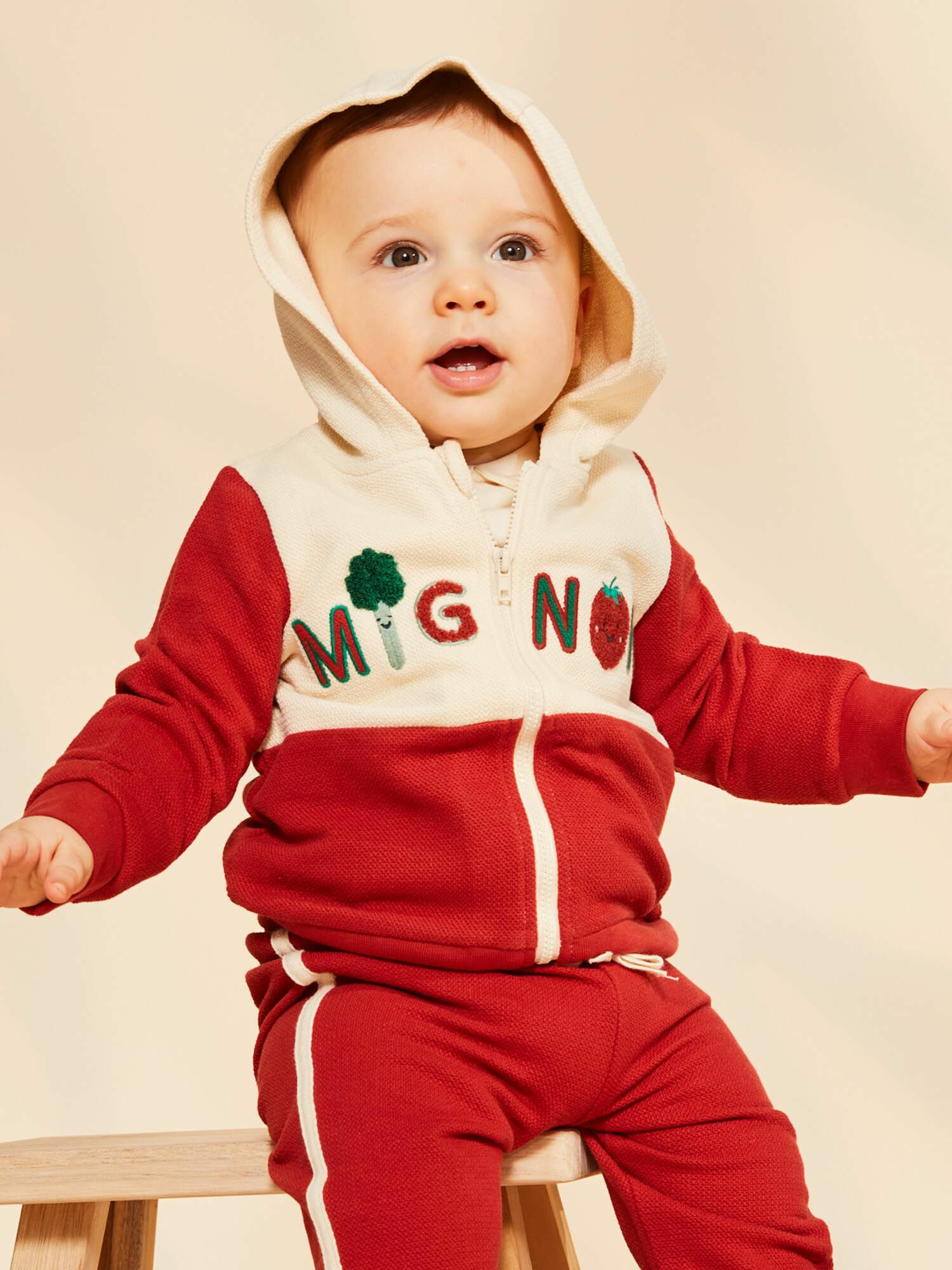 Confectionné en coton piqué doux, ce sweat associe une teinte rouge brique chaleureuse à un vanille lumineux pour un contraste élégant. La fermeture zippée écrue souligne la silhouette tout en facilitant l’enfilage. Les finitions en bord-côte aux poignets et à la base garantissent un maintien optimal et une liberté de mouvement adaptée aux activités des plus jeunes.