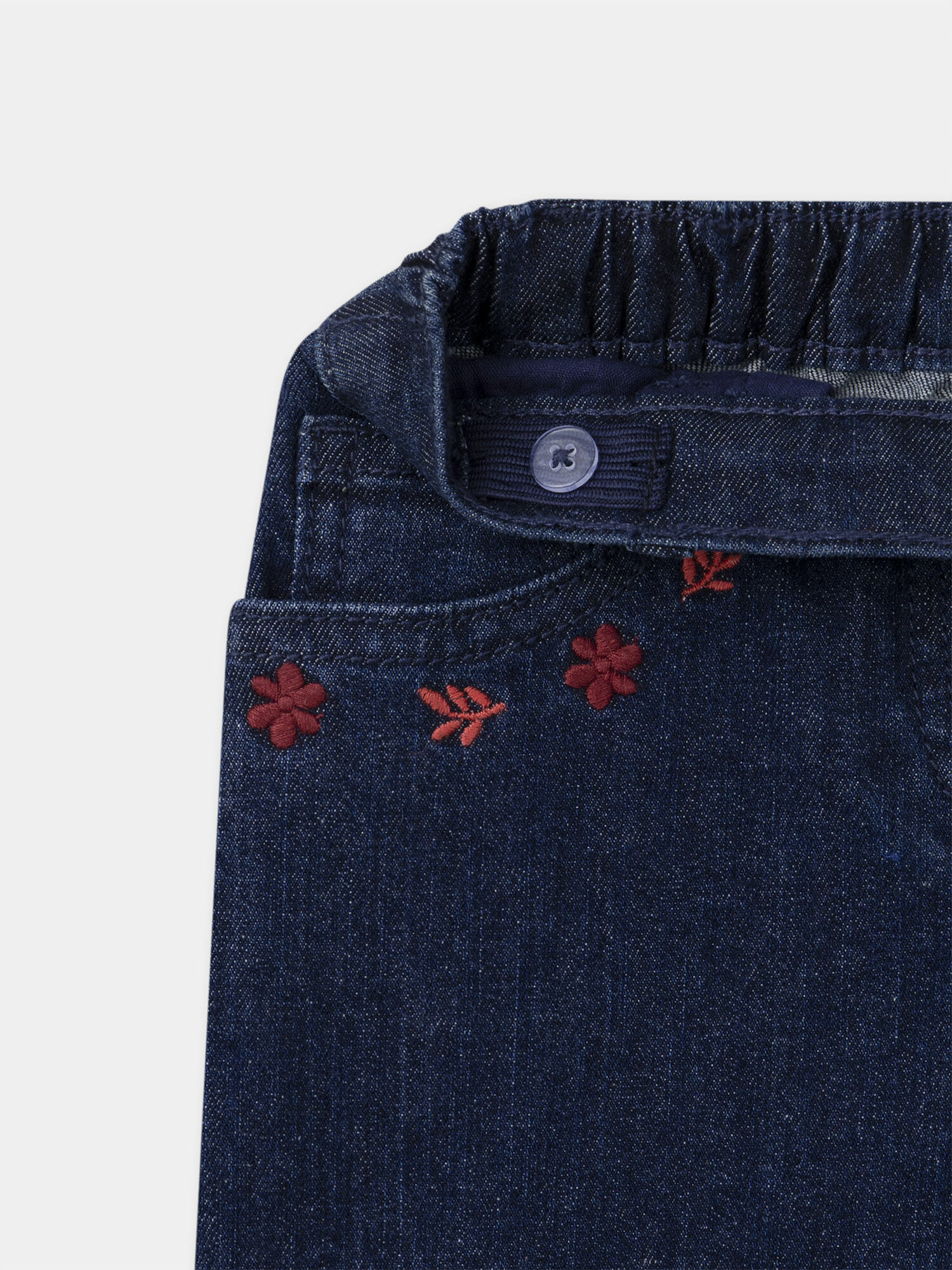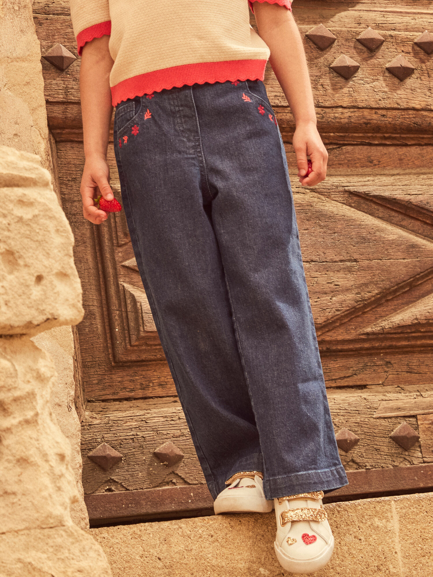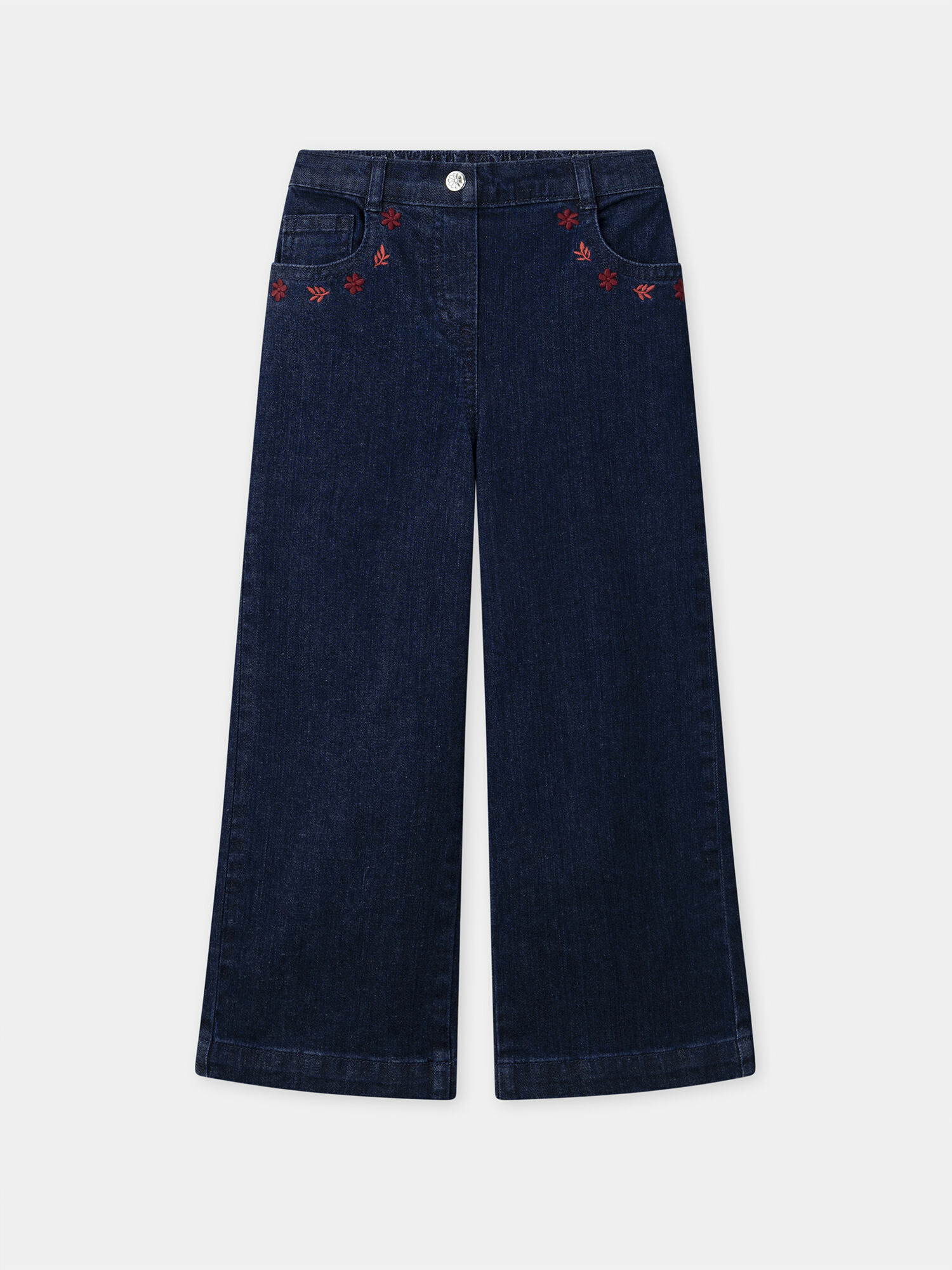 Pour les petites aventurières qui veulent allier style et confort, ce jean wide leg bleu foncé séduit par ses broderies florales rouges uniques. Une pièce audacieuse qui accompagne toutes leurs escapades avec élégance.