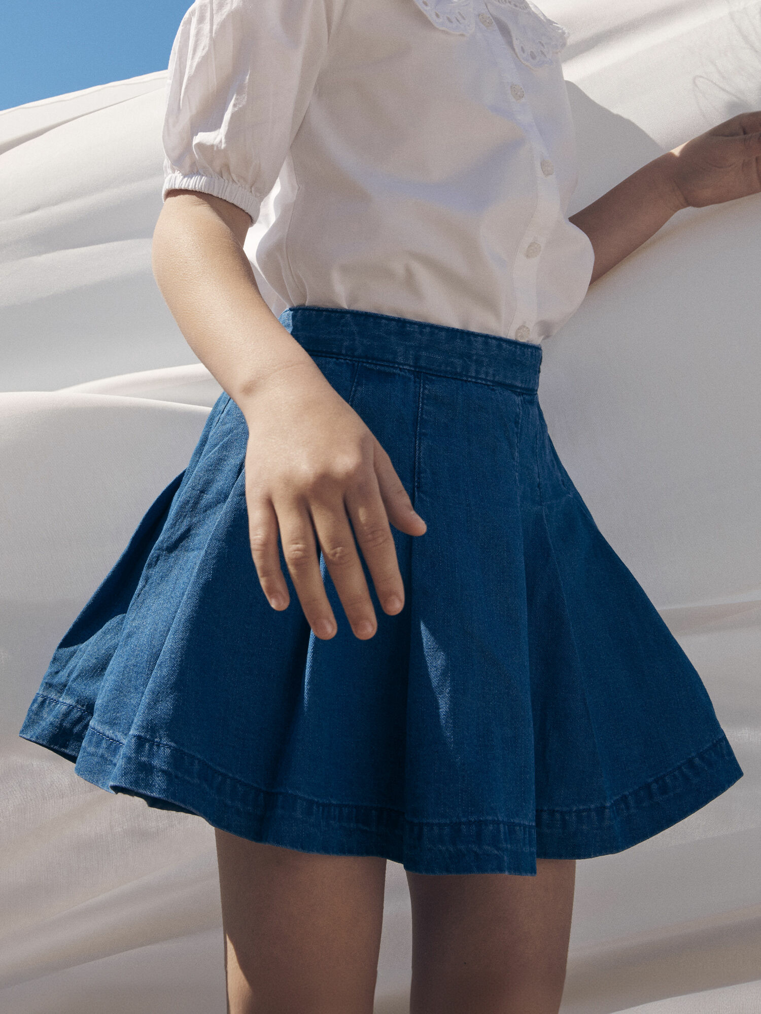 Jupe plissée en denim bleu, motifs papillons brodés à la taille, doublure en coton. Ouverture zippée latérale, patte de serrage élastique intérieure. Issue de la Collection Pastel à Lisbonne. Référence : LEJUPETTE / 24H2PFJ1JUPP272.