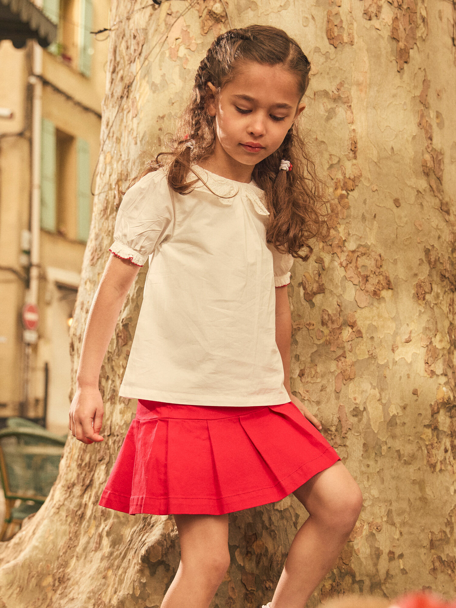 Cette jupe plissée rouge allie charme et praticité pour accompagner les filles dynamiques au quotidien. Son design en jean, rehaussé de poches brodées florales, apporte une touche de fraîcheur et d’originalité à chaque tenue.