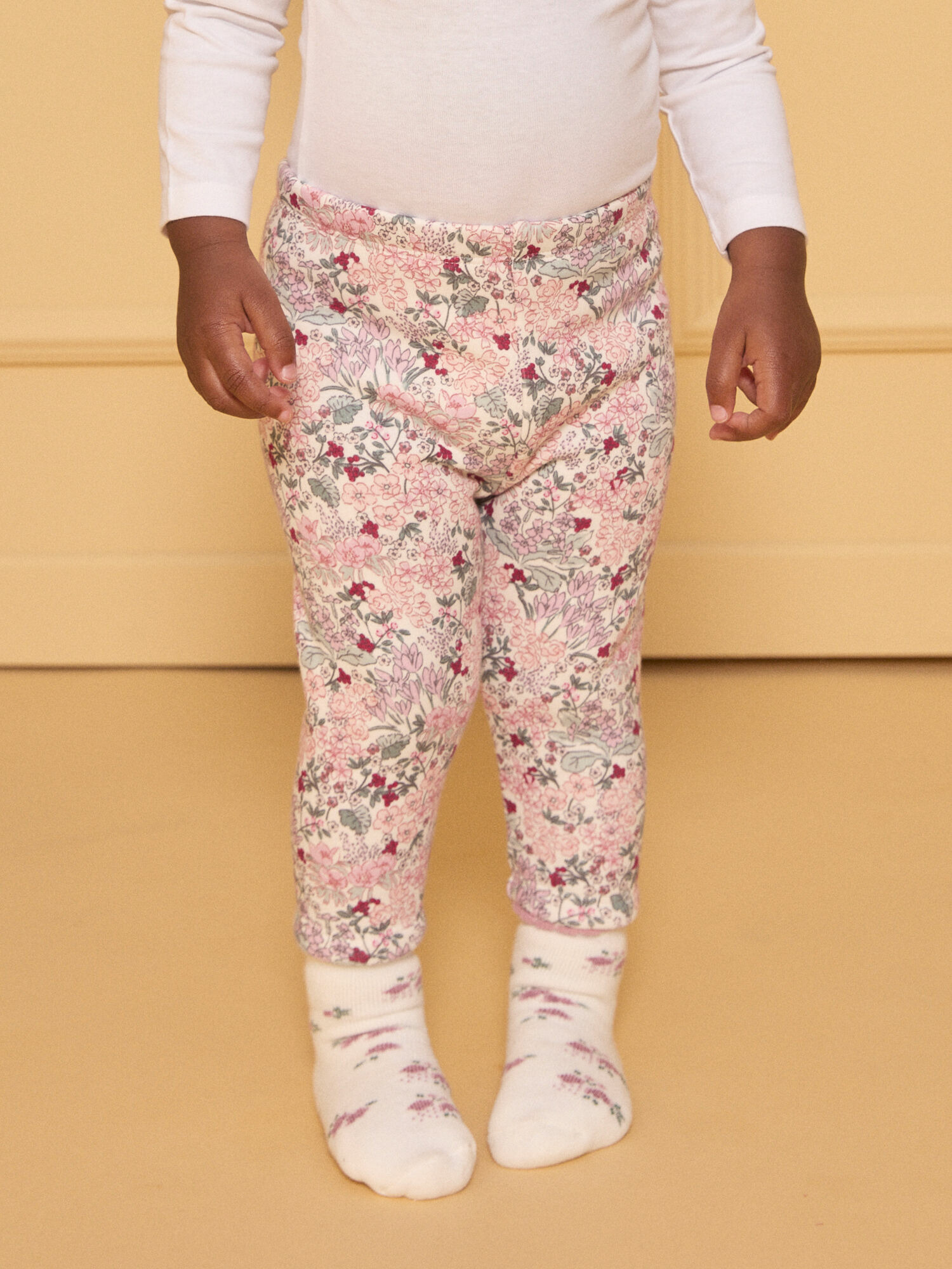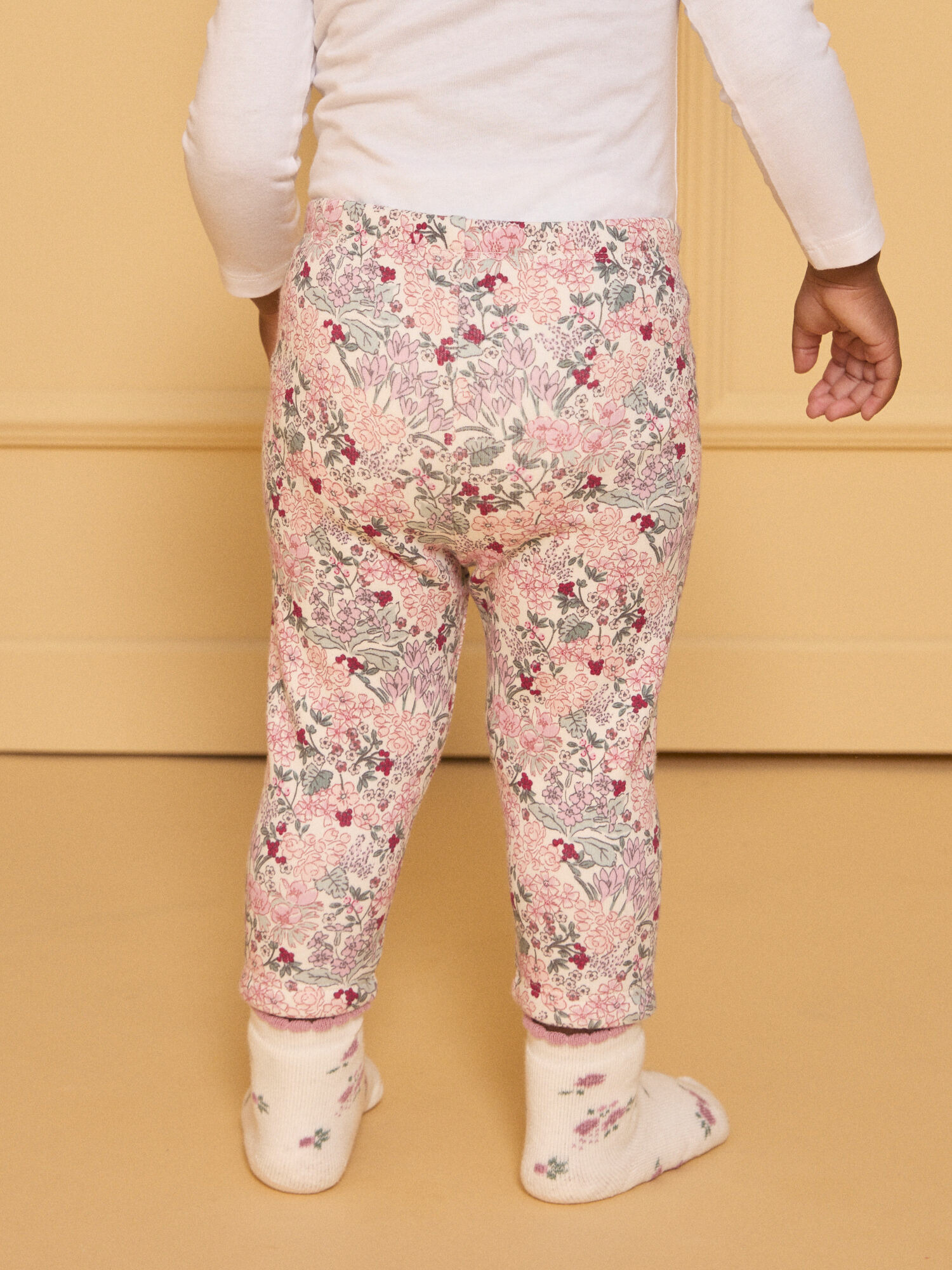 Apportez une touche printanière à la garde-robe de votre enfant avec ce legging fleuri élégant et confortable. Son imprimé délicat aux nuances de rose, prune et vert anis sur fond écru illumine chaque tenue avec légèreté.