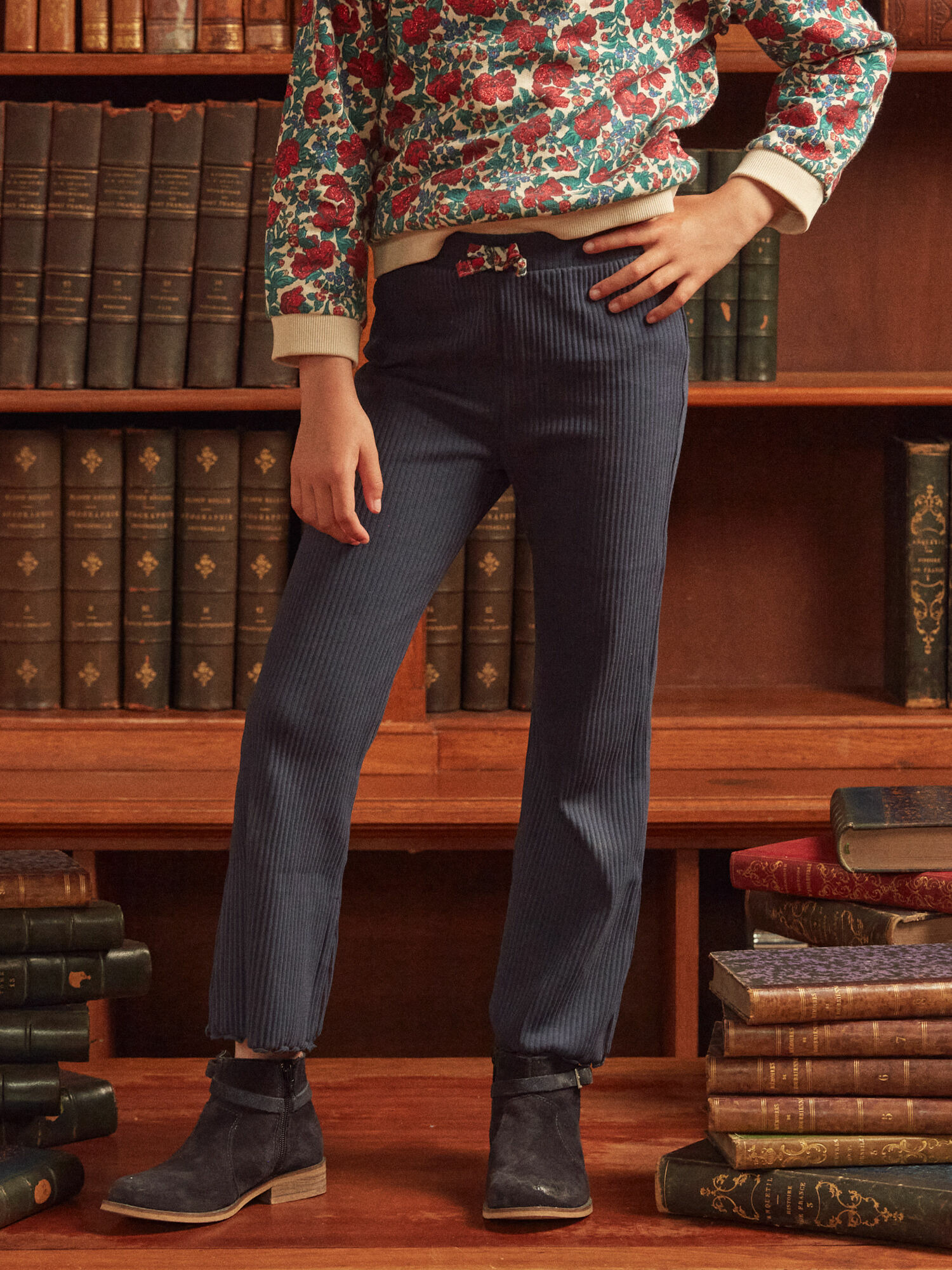 Référence LOLEGETTE / 24H2PFL1LG070. Coupe évasée en bas de jambes, noeud décoratif à motifs fleurs. Coloris marine profond, tissu doux et souple adapté aux enfants en mouvement.