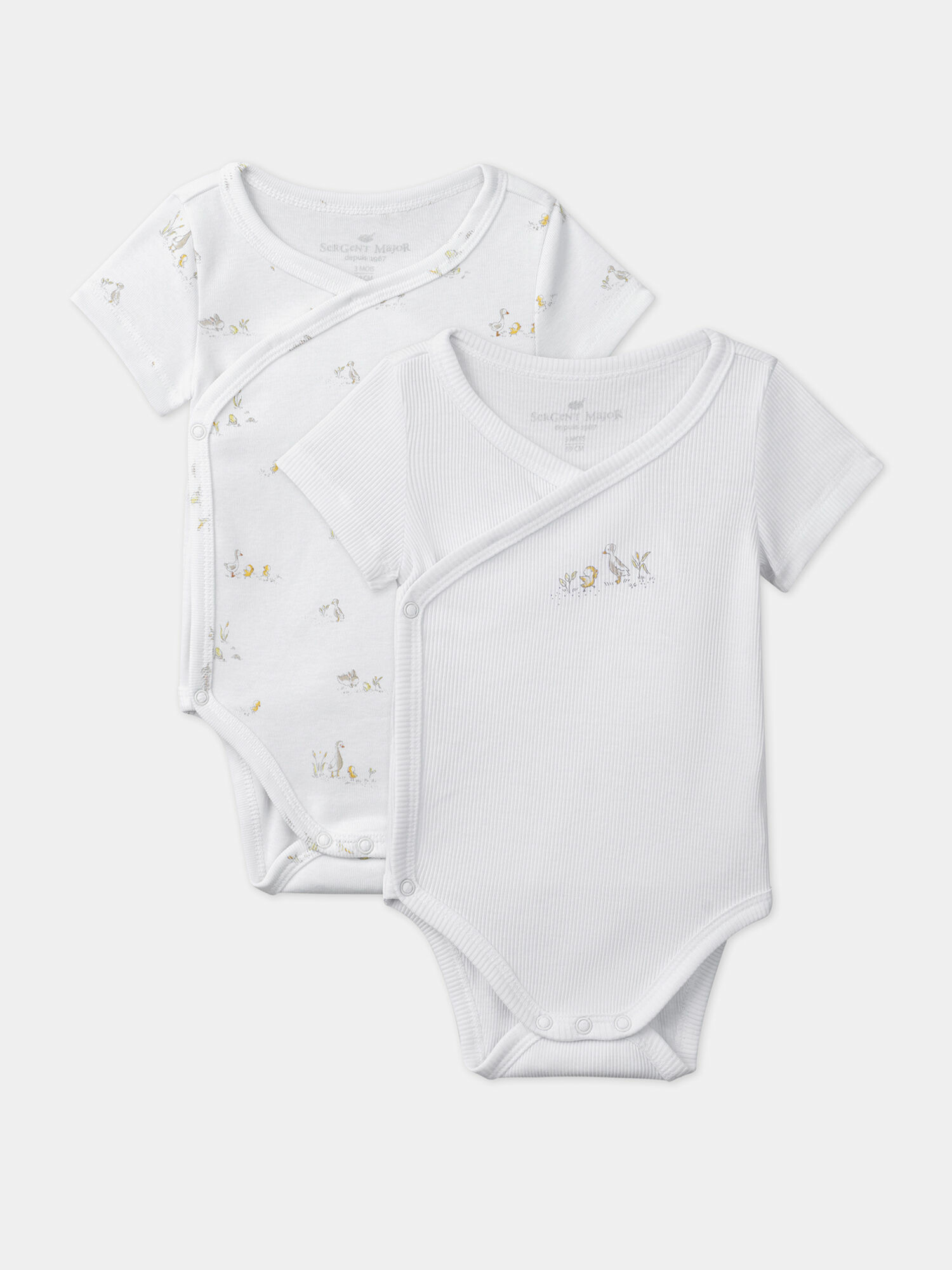 Lot de 2 bodies à manches courtes en maille côtelée 1x1 et 2x2. Imprimés animaux dans des tons beige, jaune et orangé sur fond écru. Ouverture avant croisée et à l’entrejambe par boutons pression. Languette intérieure de maintien. Collection Un été bucolique. Référence : MONRAN / 25E0NMI1BOD000.