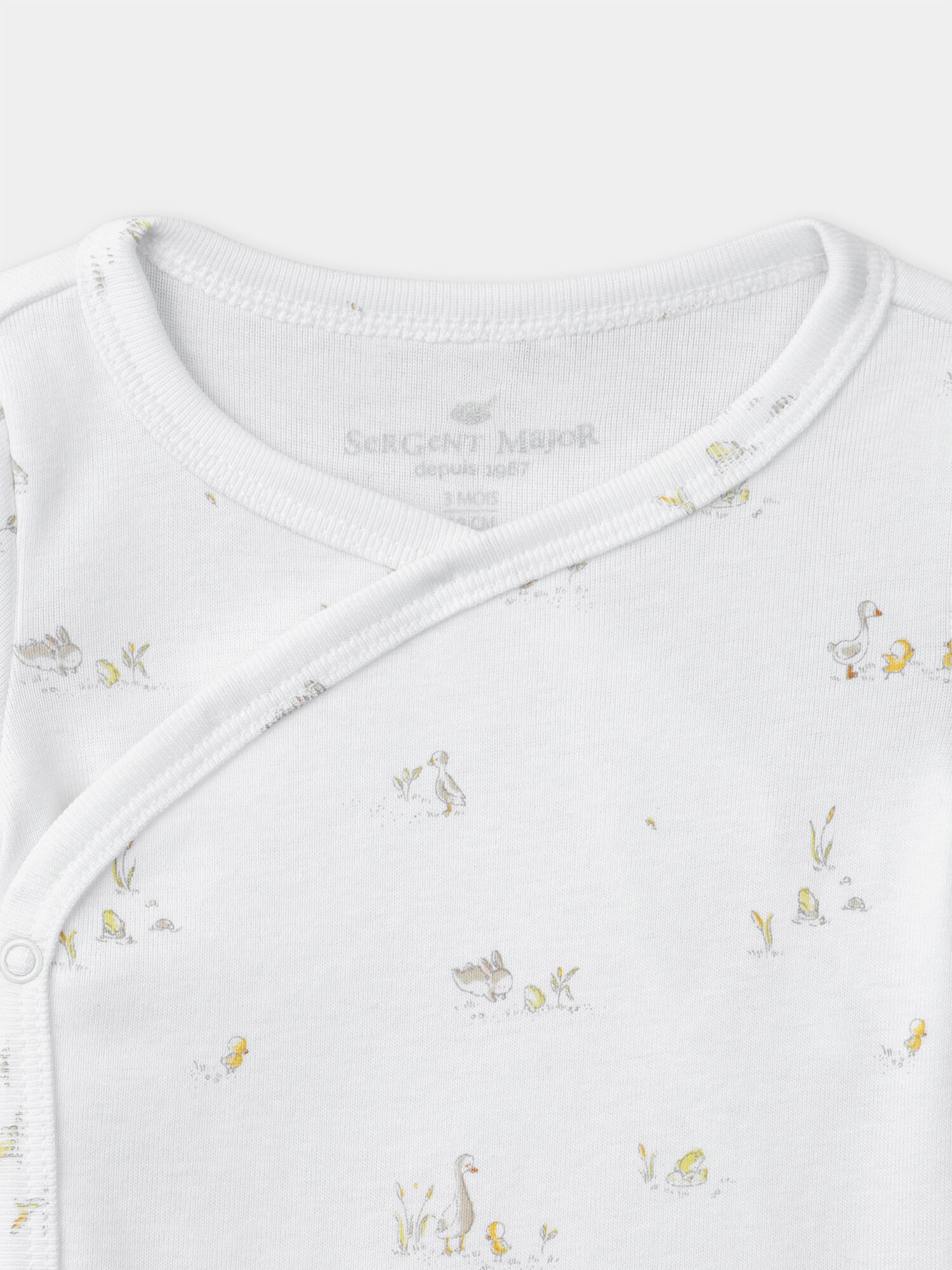 Réponse. Les bodies présentent des motifs d’animaux de la ferme et une scène avec une oie et un poussin, dans des tons doux beige, jaune et orangé sur fond écru.
