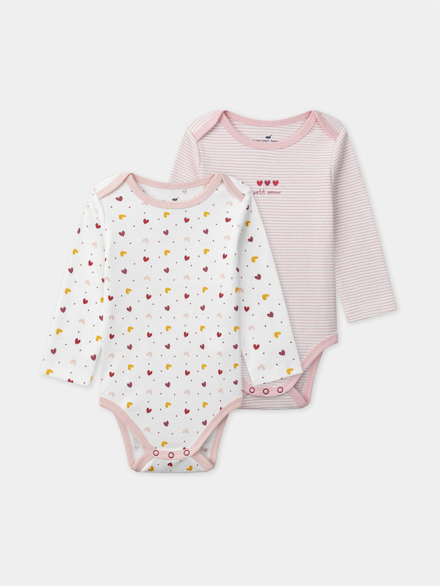Le premier body séduit par son imprimé coeurs et pois aux nuances roses, jaunes et rouges, rehaussé d’un liseré rose pâle qui souligne subtilement le col et les cuisses. Le second mise sur la simplicité raffinée avec ses fines rayures rose pâle sur fond écru, agrémentées de trois coeurs rouges et lie de vin accompagnés de l’inscription "petit amour". Ces bodies incarnent une esthétique douce et moderne, parfaite pour les petits looks quotidiens.
