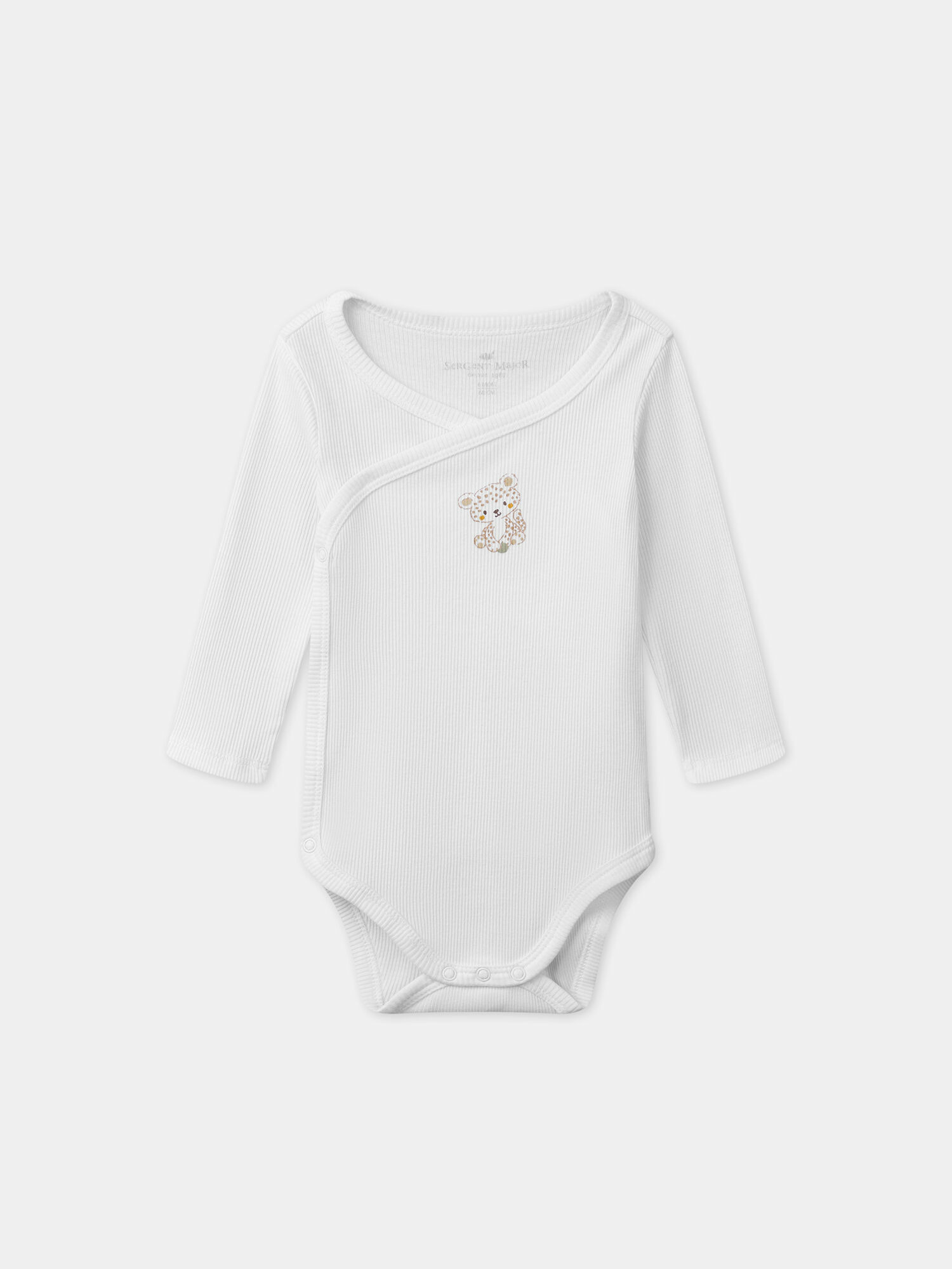 Chaque body joue sur des tons naturels et apaisants : le premier affiche un imprimé léopard noisette et vert amande sur fond écru, tandis que le second, à côtes 2x2, présente un léopard stylisé aux nuances miel, beige et vert amande. Leur texture côtelée assure une agréable sensation au toucher, tandis que l’ouverture croisée à l’avant et les boutons pression à l’entrejambe facilitent habillage et changes. Vendu dans une boîte soignée, ce lot s’inscrit dans la collection Naissance, gage de qualité et d’attention portée aux tout-petits.