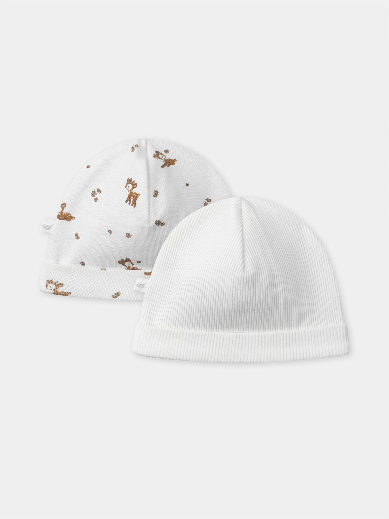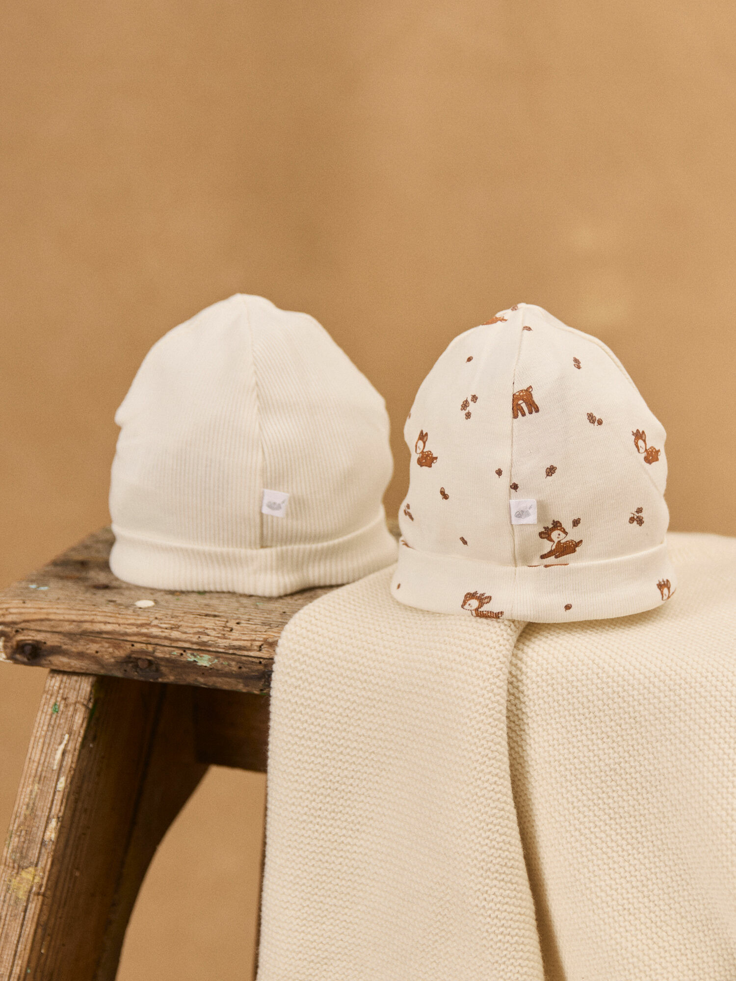 Fabriqués en coton issu de l’agriculture biologique, ils respectent à la fois la peau de bébé et l’environnement. Ce lot comprend un bonnet à côtes imprimé et un bonnet écru à côtes 2x2, vendus avec une étiquette cadeau en forme de faon. Pour en savoir plus sur leurs qualités environnementales, consultez la fiche produit dédiée.
