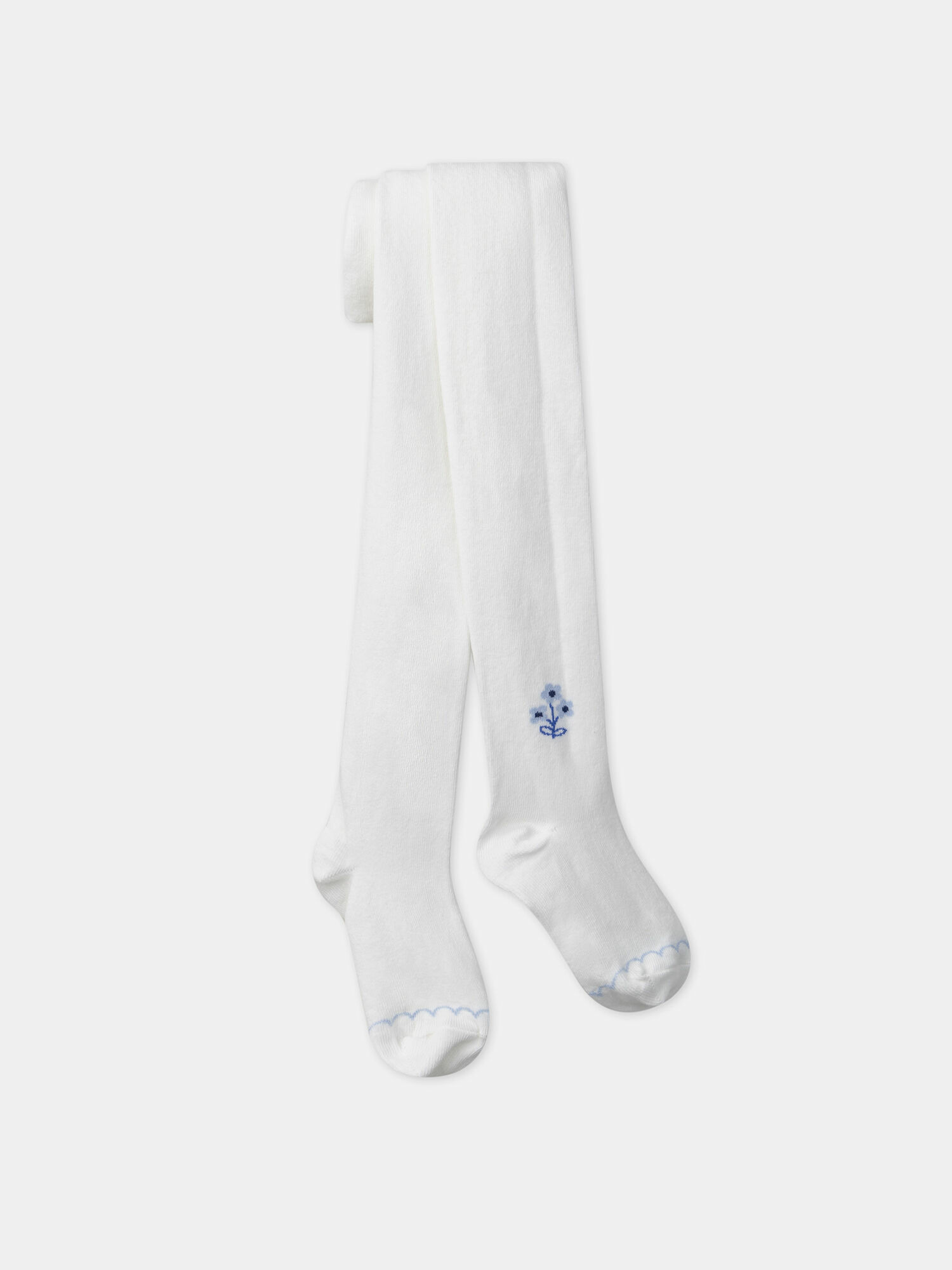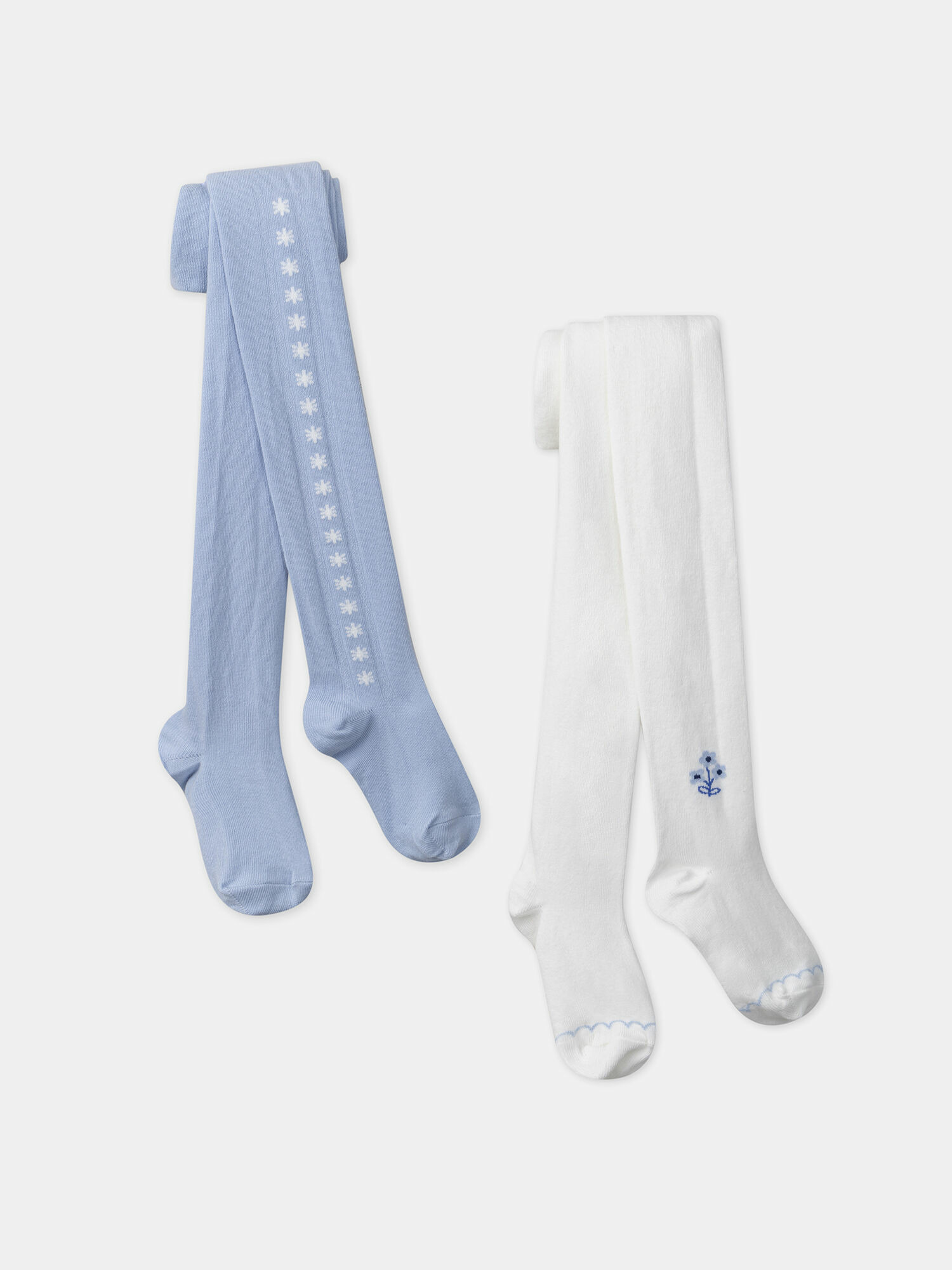 Lot composé de deux collants : un bleu ciel avec tresse de fleurs sur le côté, un écru avec jacquard fleur à la cheville et détail coquille sur le pied. Référence produit : MEDUETTE / 25E4PF81COL020. Ce produit fait partie de la collection Bleu de Bleuets. Pour plus d’informations sur ses qualités et caractéristiques environnementales, consultez la fiche produit dédiée.
