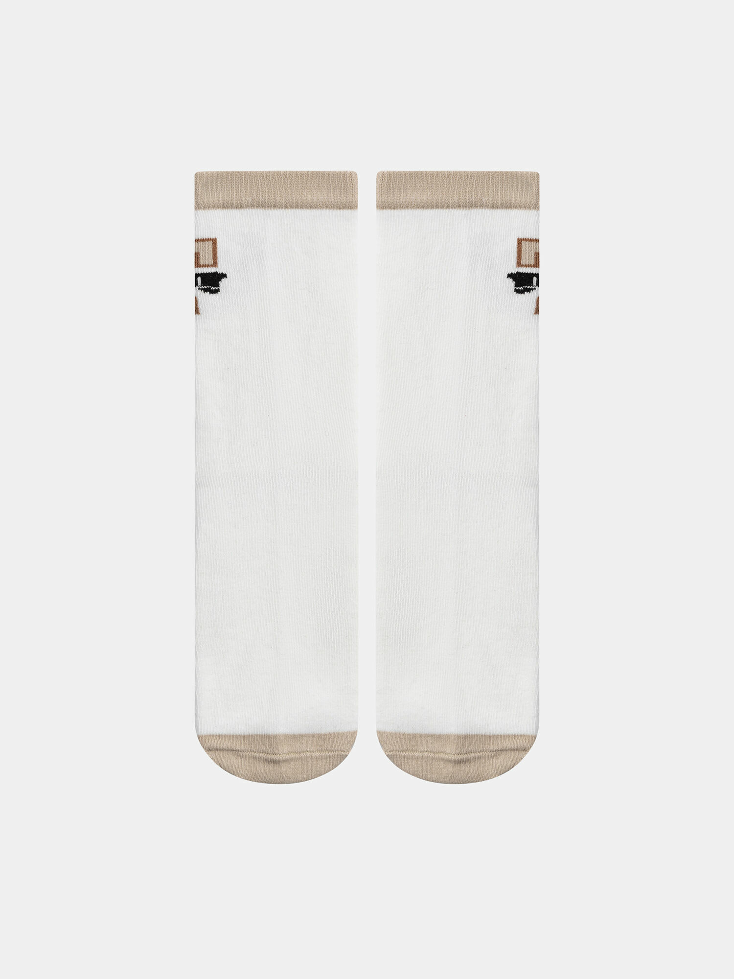 - Chaussettes 1 : bicolore écru sur fond marron, tête de renard sur le haut, bord-côtes, talon et pointe contrastés, inscription Championship sous le pied.