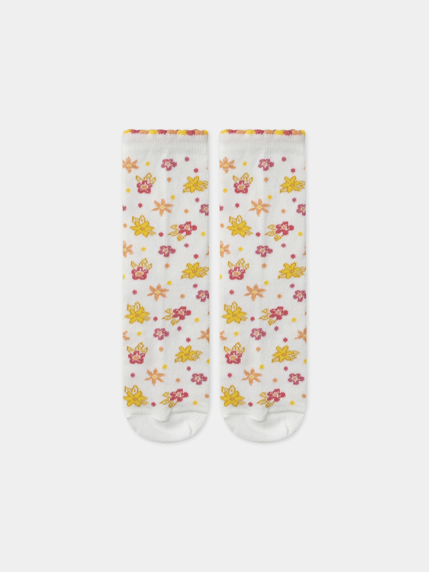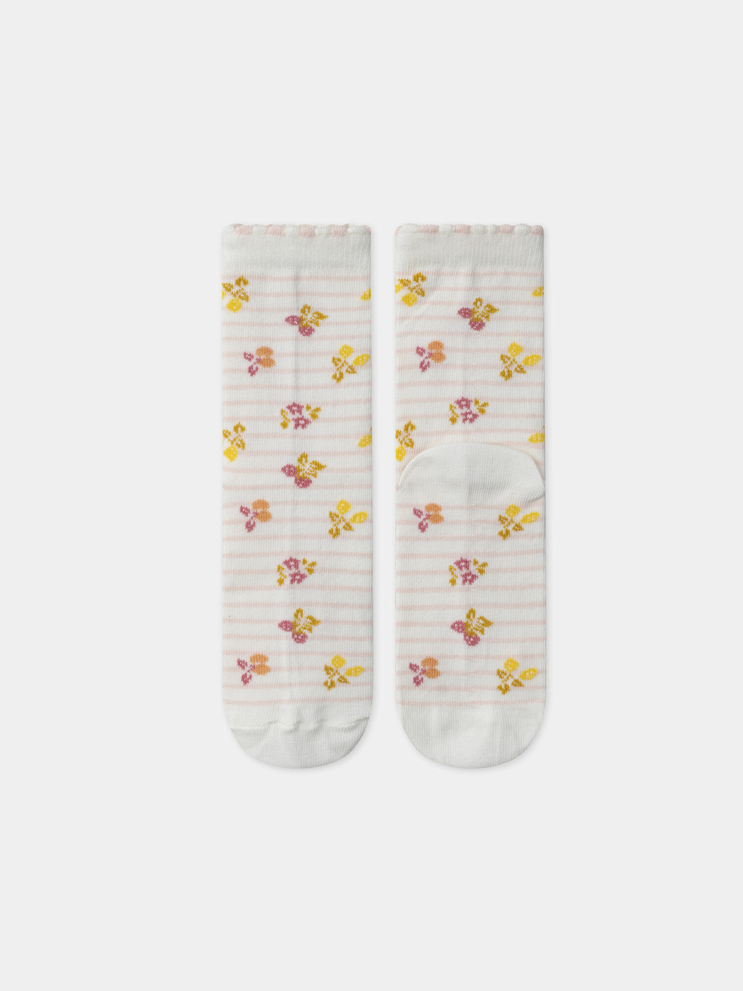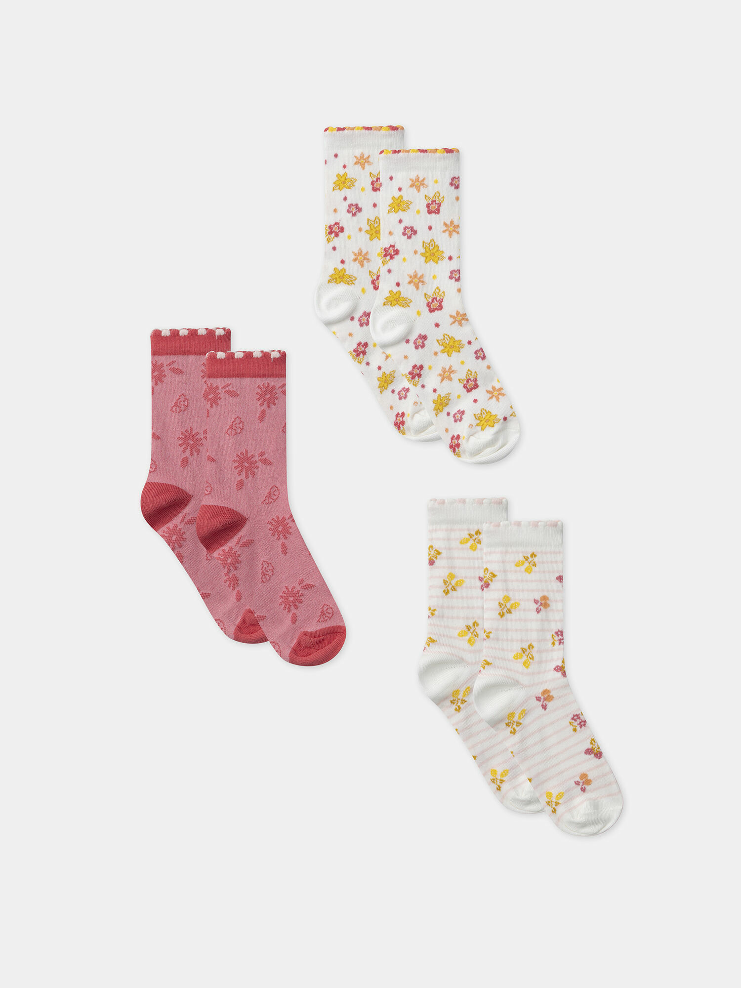Ces chaussettes mêlent motifs délicats et finitions soignées. La première paire joue sur des rayures roses pâles rehaussées de jacquards de fraises, cerises et citrons, avec des pointes et talons unis. La deuxième affiche un bouquet de fleurs roses, jaunes et oranges sur fond écru, tandis que la troisième mise sur un jacquard fleuri ton sur ton rose foncé, pour un style plus subtil. Conçues pour le confort et la tenue, elles s’intègrent parfaitement à la collection Jaune de Tournesol.