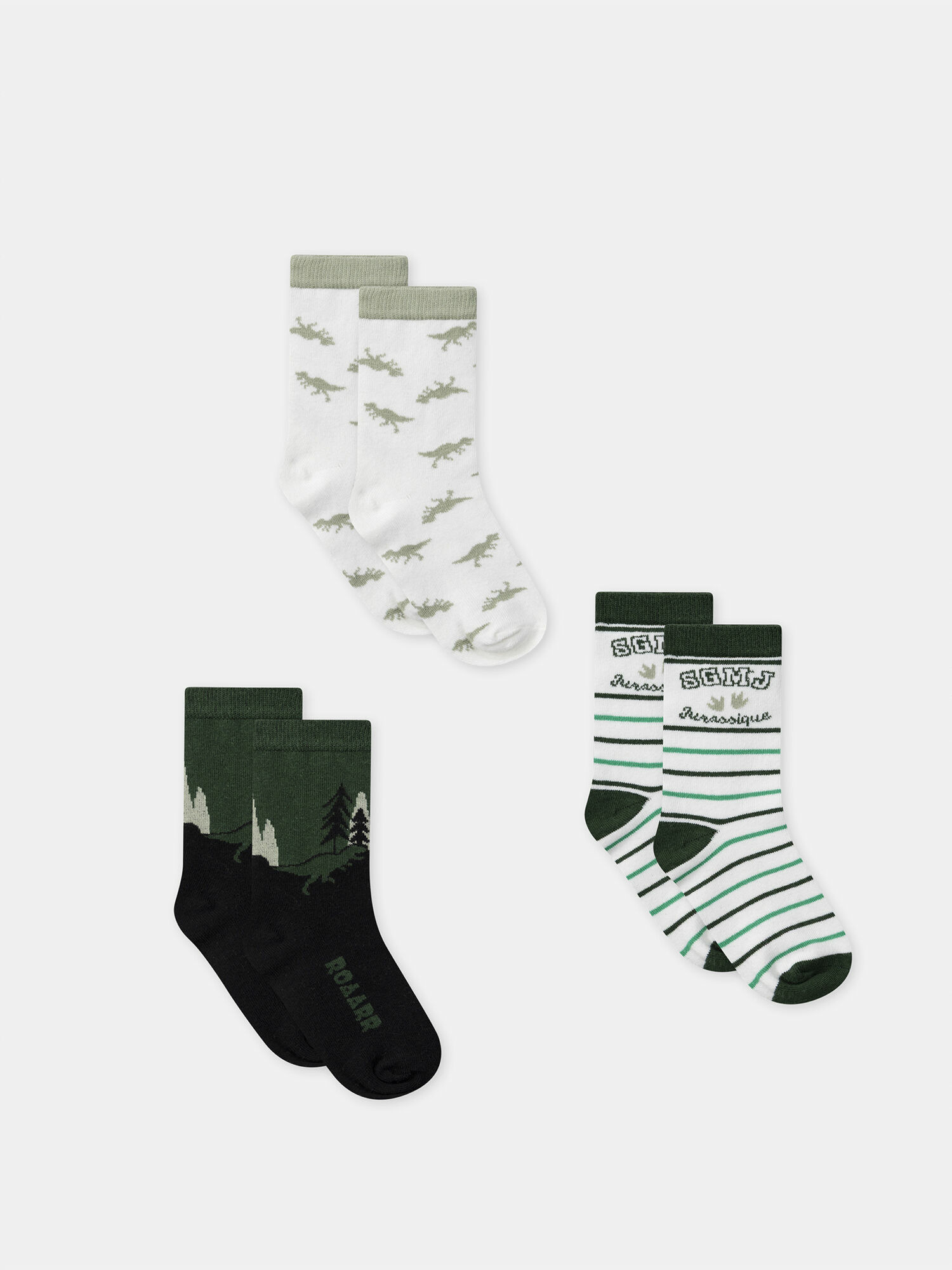 - Chaussette 3 : bicolore vert foncé et noir, jacquard forêt et dinosaure sur le haut du pied, jacquard "ROAARR" sous le pied