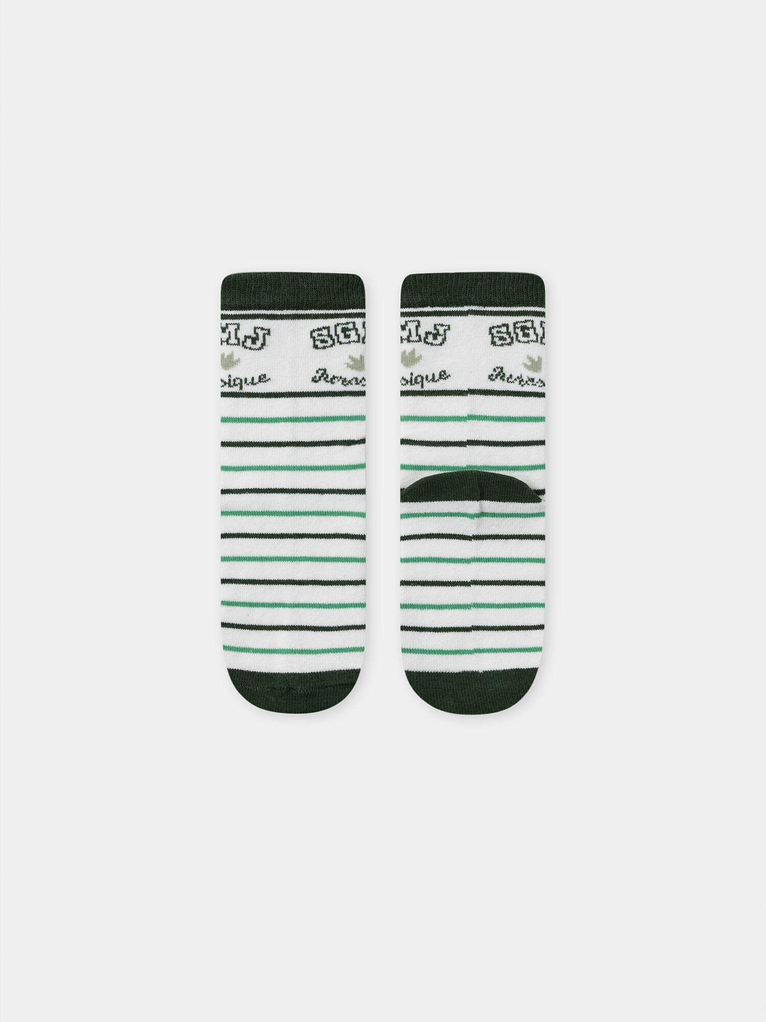 - Chaussette 2 : fond écru rayé vert vif et vert foncé, jacquard "SGMJ Jurassique" et empreintes sur la cheville, pointes, rib et talons unis vert foncé