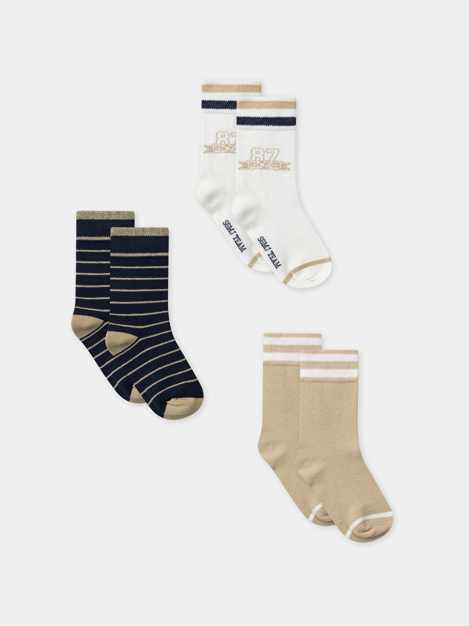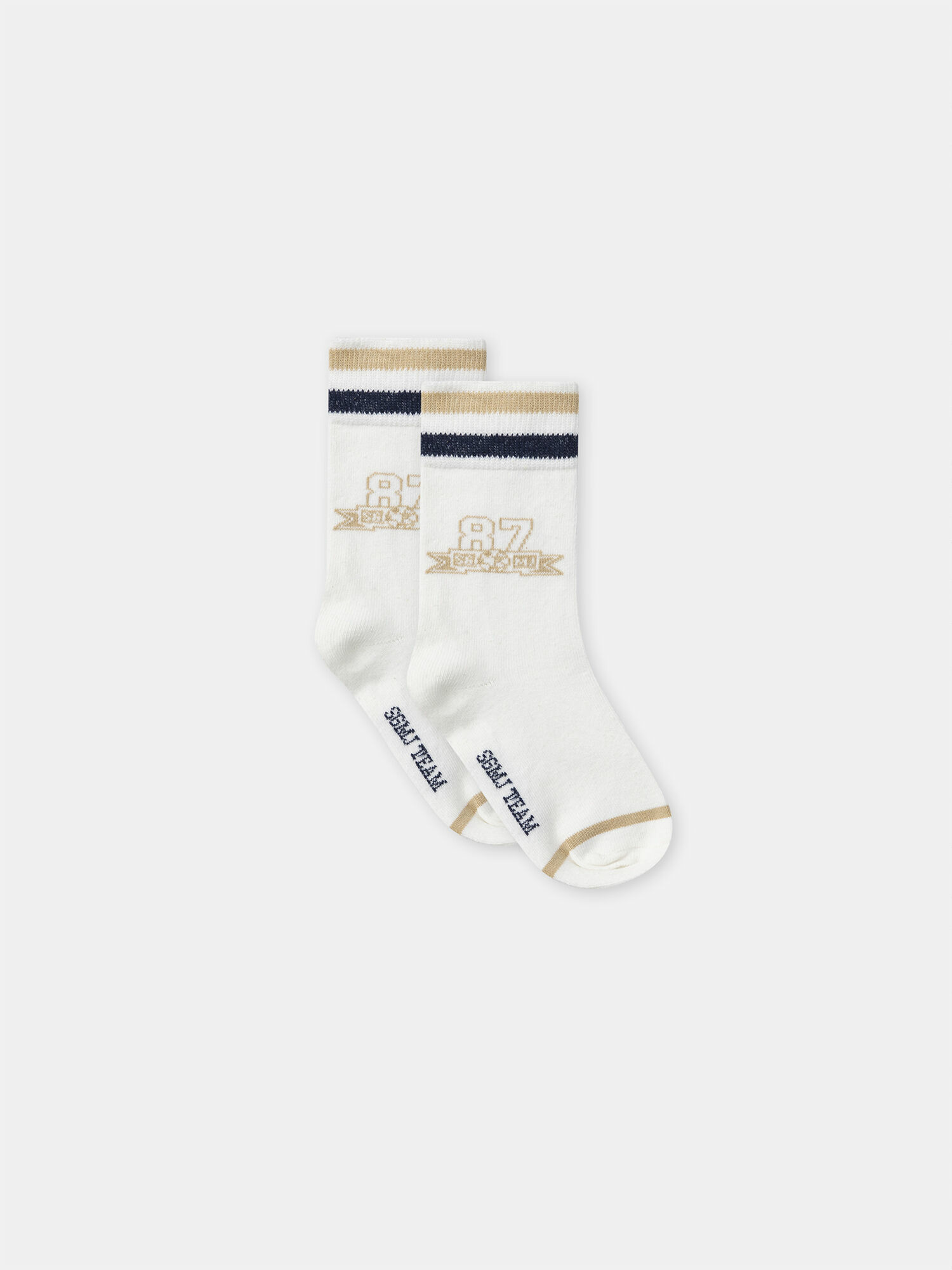 - Chaussette 2 : fond écru, jacquard « 87 sgmj » à la cheville, rib rayé écru, beige et marine, jacquard « SGMJ Team » sous le pied.