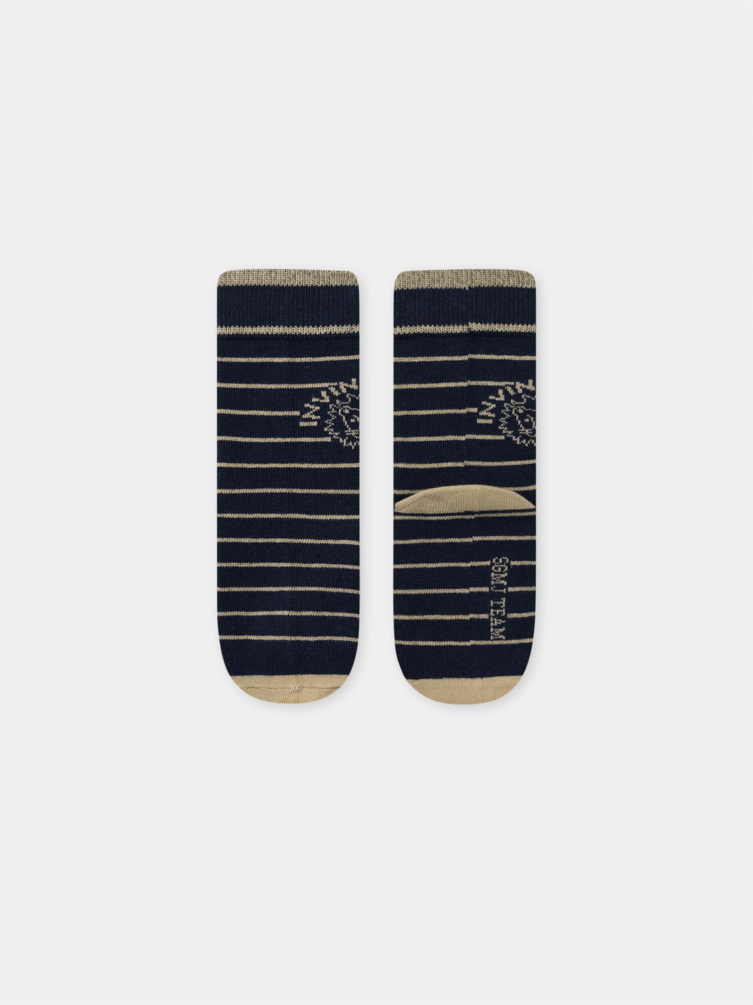 - Chaussette 3 : fond marine rayé beige foncé, jacquard « Invincible » et tête de lion à la cheville, pointes et talons unis beige foncé, jacquard « SGMJ Team » sous le pied.