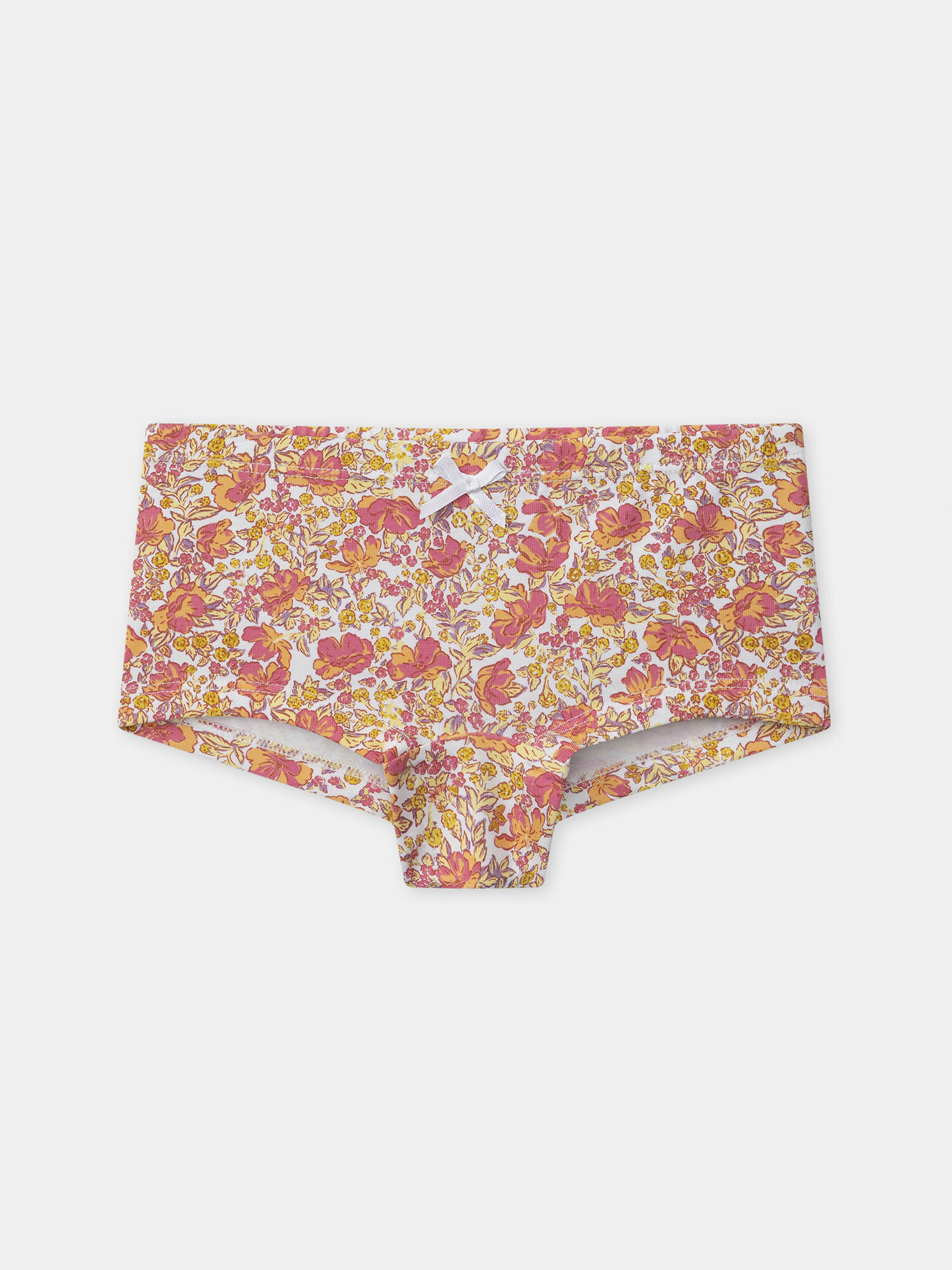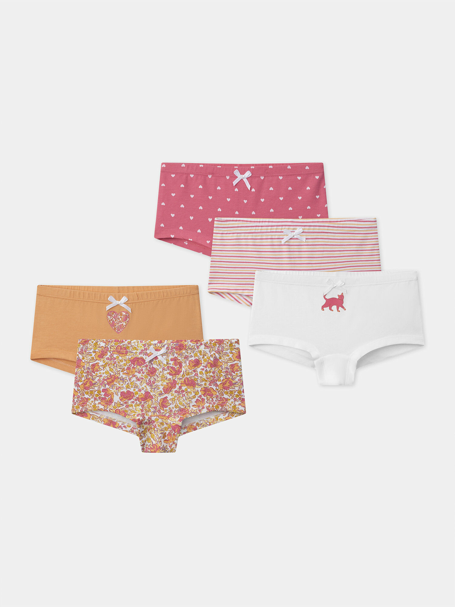 Lot de 5 shorties pour fille, incluant : shorty fleuri avec nœud, shorty écru imprimé chat avec nœud, shorty écru à rayures avec nœud, short rose à cœurs blancs avec nœud, short orange imprimé cœur avec nœud. Coton biologique et minimum 20 % de matières recyclées. Collection Lingerie Sergent Major. Référence : NEJUETTE / 25H5PFC3SHY001.