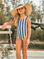 Ce maillot de bain une pièce rayé bleu est conçu pour accompagner les filles avec légèreté et liberté de mouvement. Sa coupe ajustée met en valeur la silhouette tout en garantissant un maintien optimal, idéal pour jouer, nager ou se détendre. La rayure bleue apporte une note fraîche et dynamique, parfaite pour un look estival réussi.