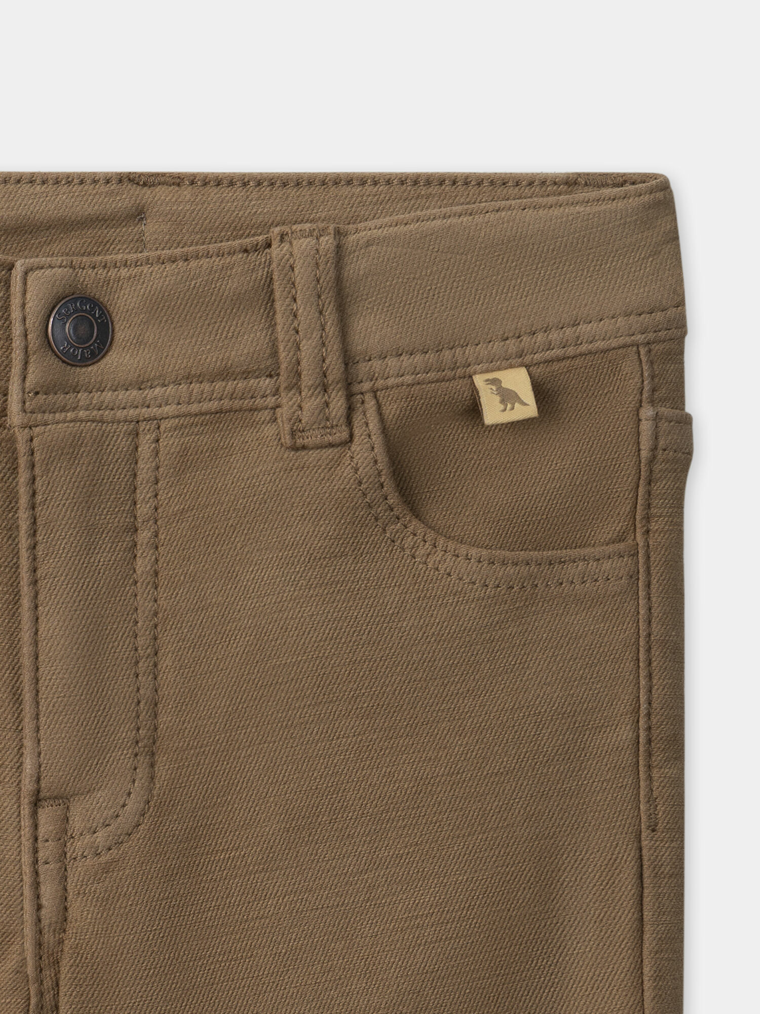 Pantalon en knit denim camel avec cinq poches (deux avant dont une mini, deux arrière), passants pour ceinture, jacron arrière, taille ajustable, fermeture à bouton pression et zip. Ce modèle fait partie de la collection Terre de Chardons.