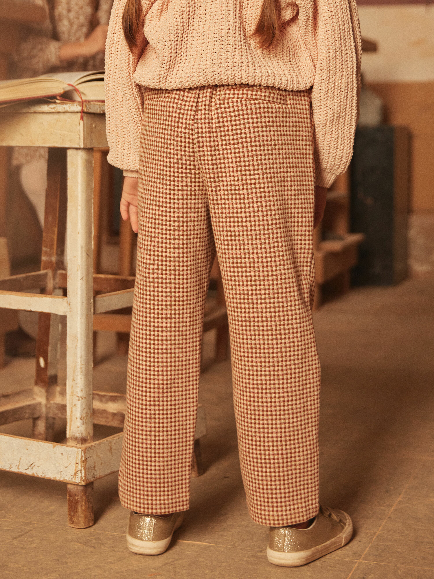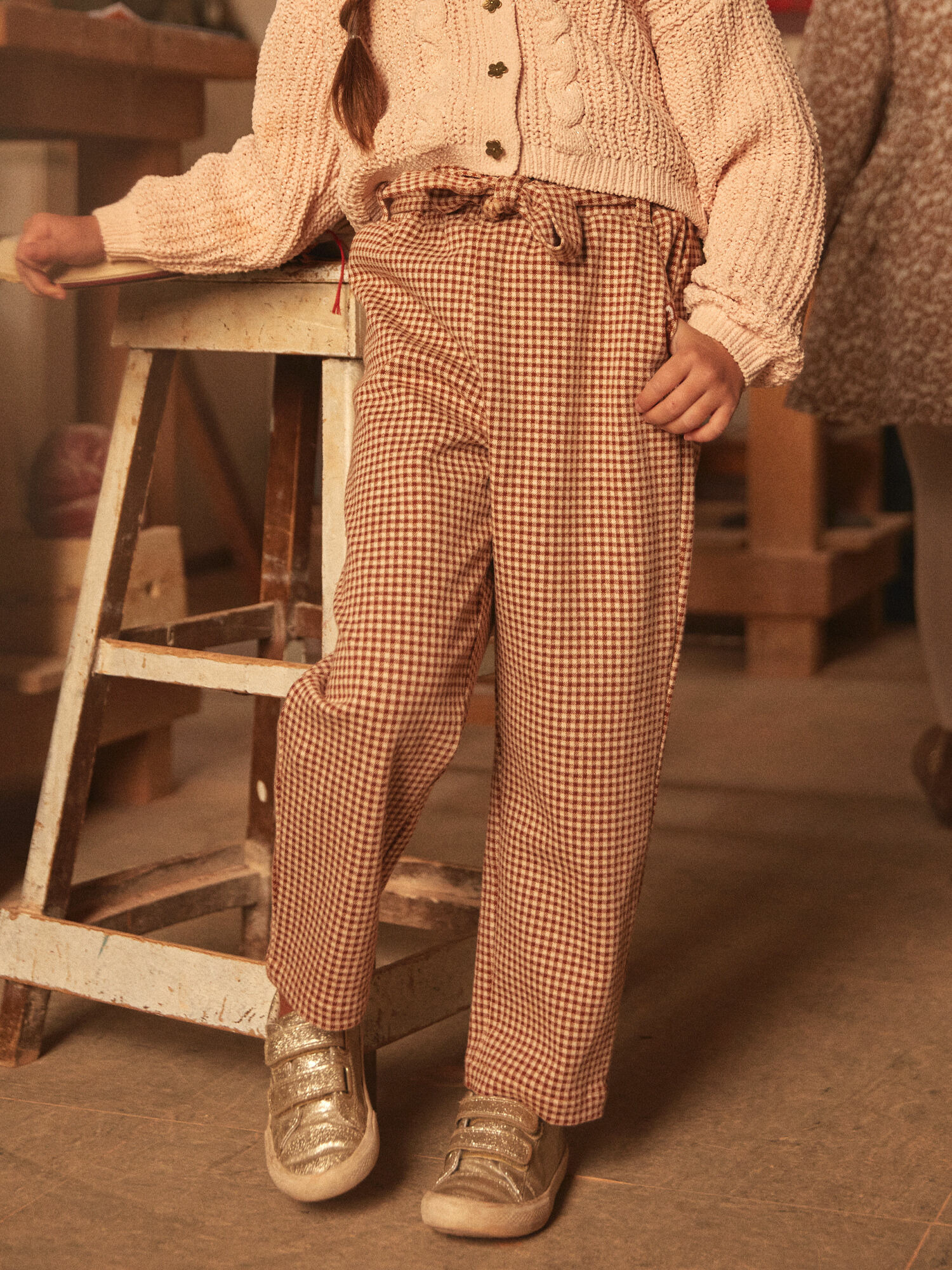 Confectionné en jersey milano, ce pantalon à la coupe carrot épouse parfaitement les mouvements des enfants dynamiques. Son motif à carreaux intemporel s’associe à des broderies fleurs délicates en bas des poches, apportant une touche subtile et ludique. Facile à porter, il s’adapte à toutes les occasions, du jeu en extérieur aux sorties casual chic.