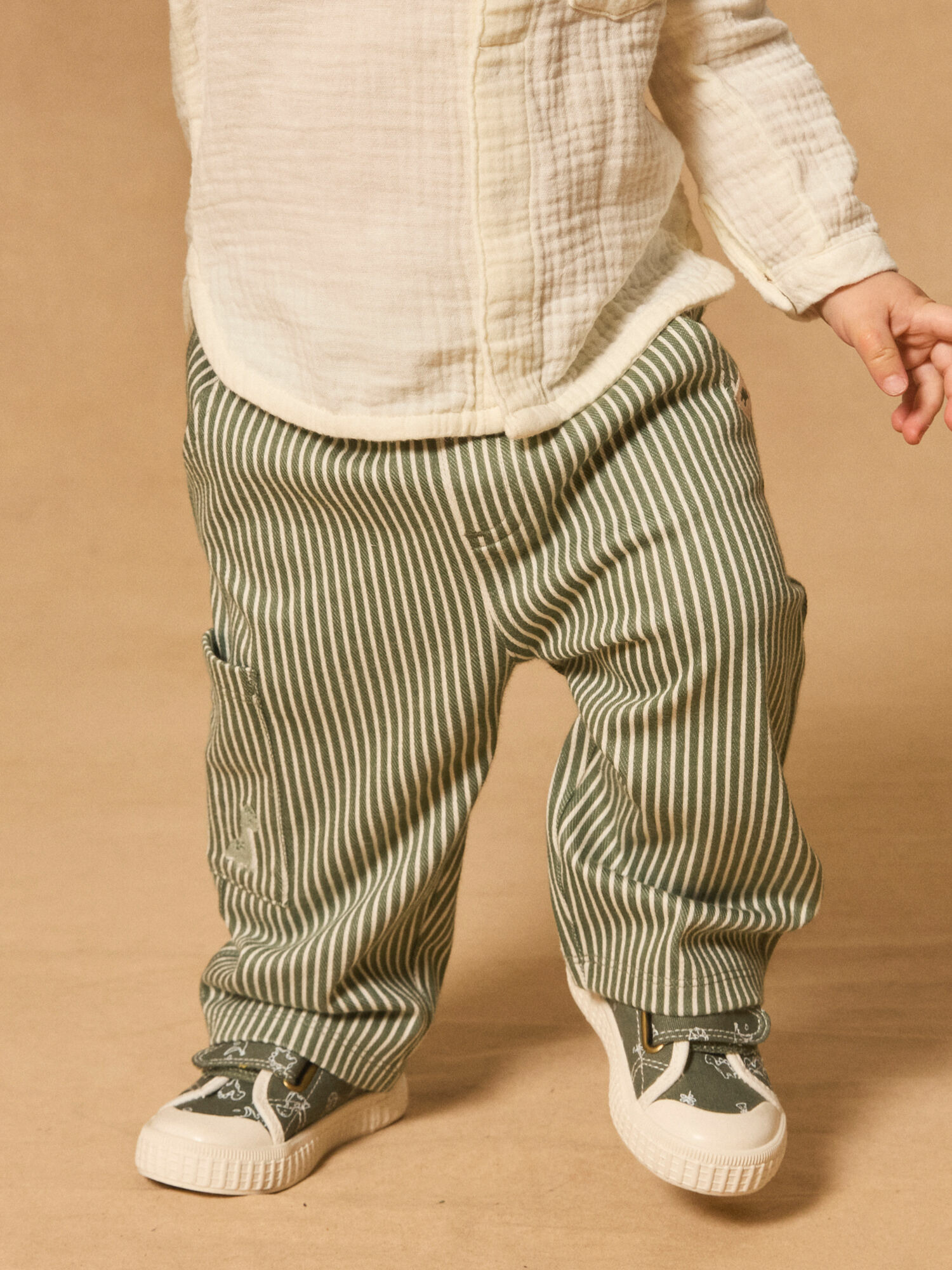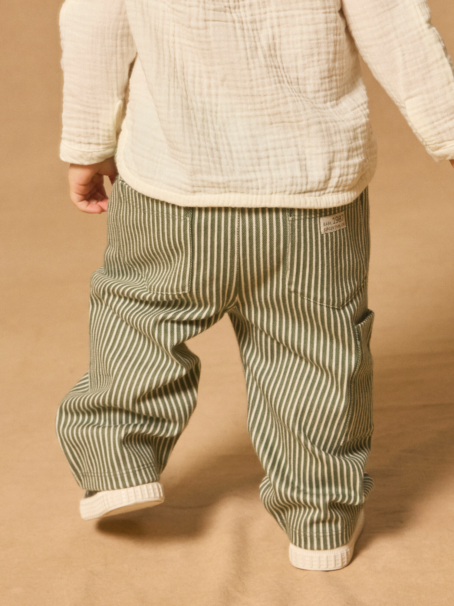 Ce pantalon confort rayé séduit par sa coupe souple et sa taille élastiquée ajustable grâce à un cordon de resserrage, garantissant un maintien optimal tout au long de la journée. Les poches avant et latérales, ornées d’un dinosaure brodé, apportent une touche ludique tandis que les poches arrière, décorées d’une vignette tissée "Baby 1987 Sergent Major", soulignent son caractère unique. L’ouverture entrejambe par boutons à pression facilite l’habillage et le change, un vrai plus pour les parents.