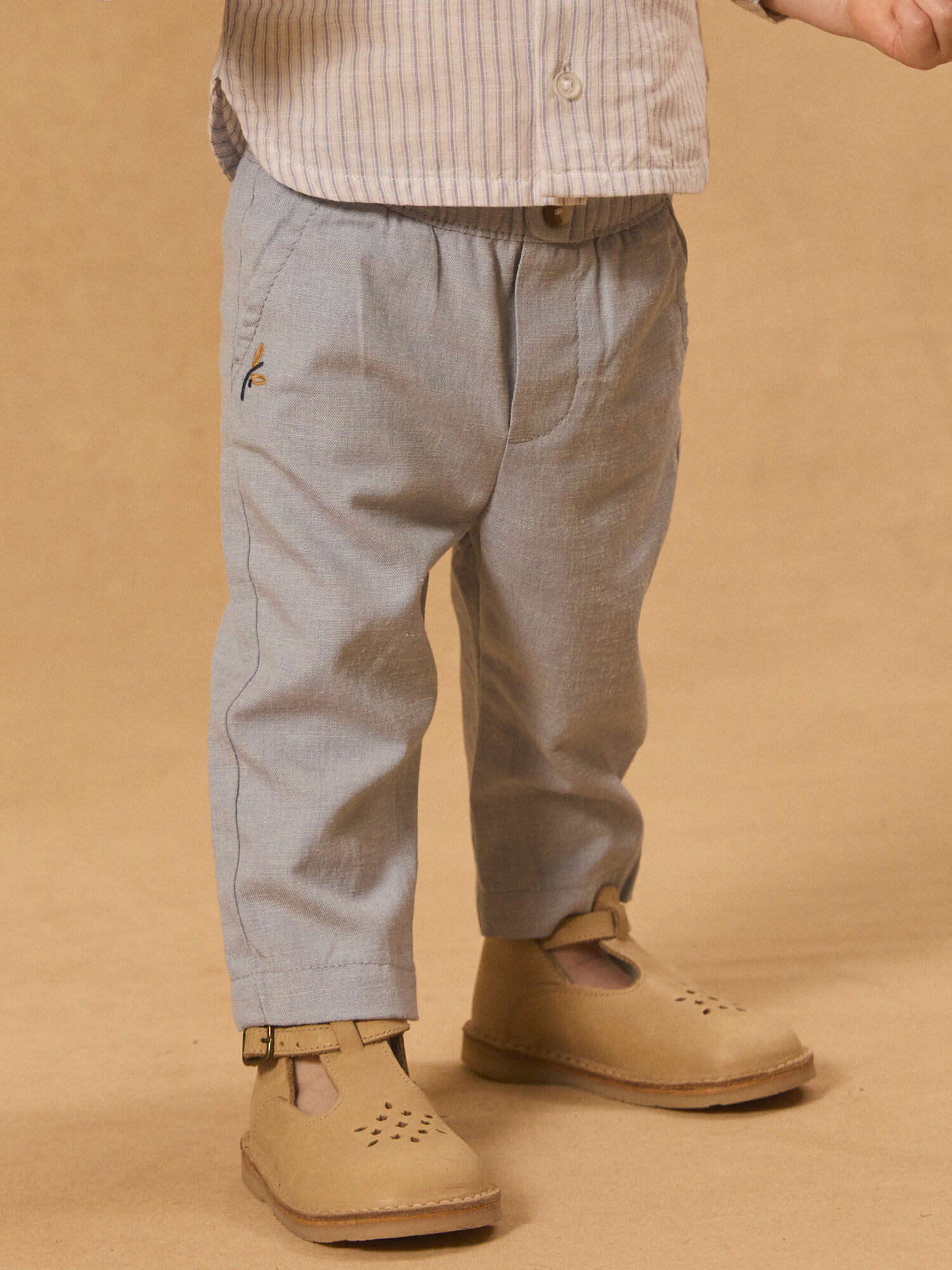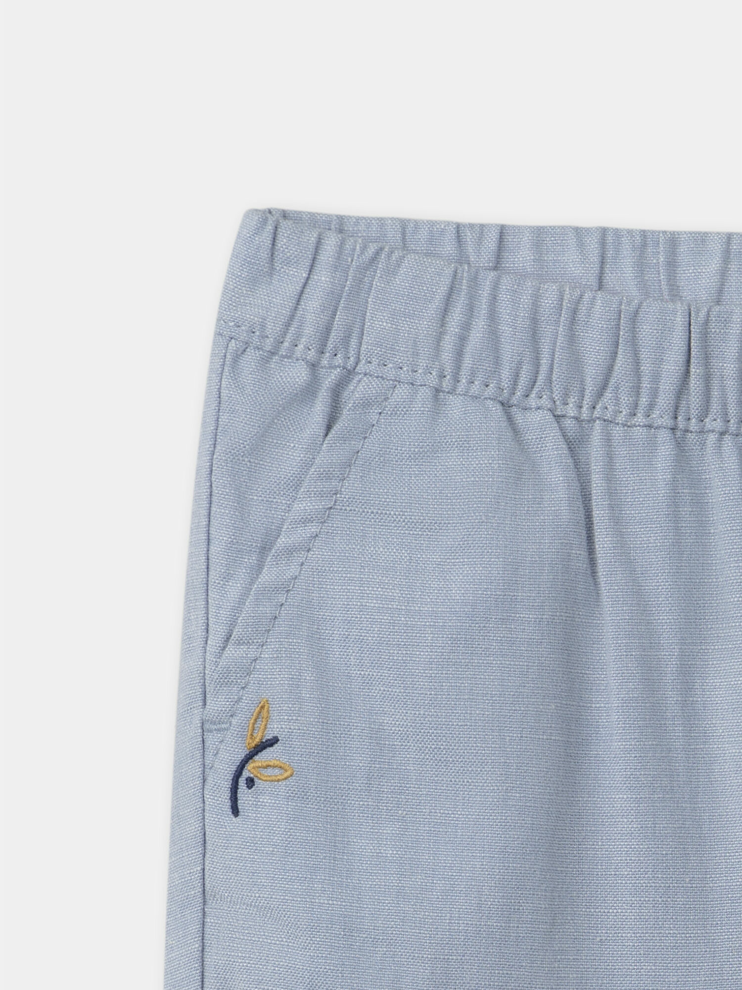 Ce pantalon en canvas dispose de deux poches avant et deux poches arrière, une taille élastiquée ajustable par bouton (uniquement du 12M au 36M), un bouton décoratif fantaisie sur la taille, des broderies feuilles à l’avant et un patch "Sergent Major" à l’arrière. Il fait partie de la collection Ciel de Coton.