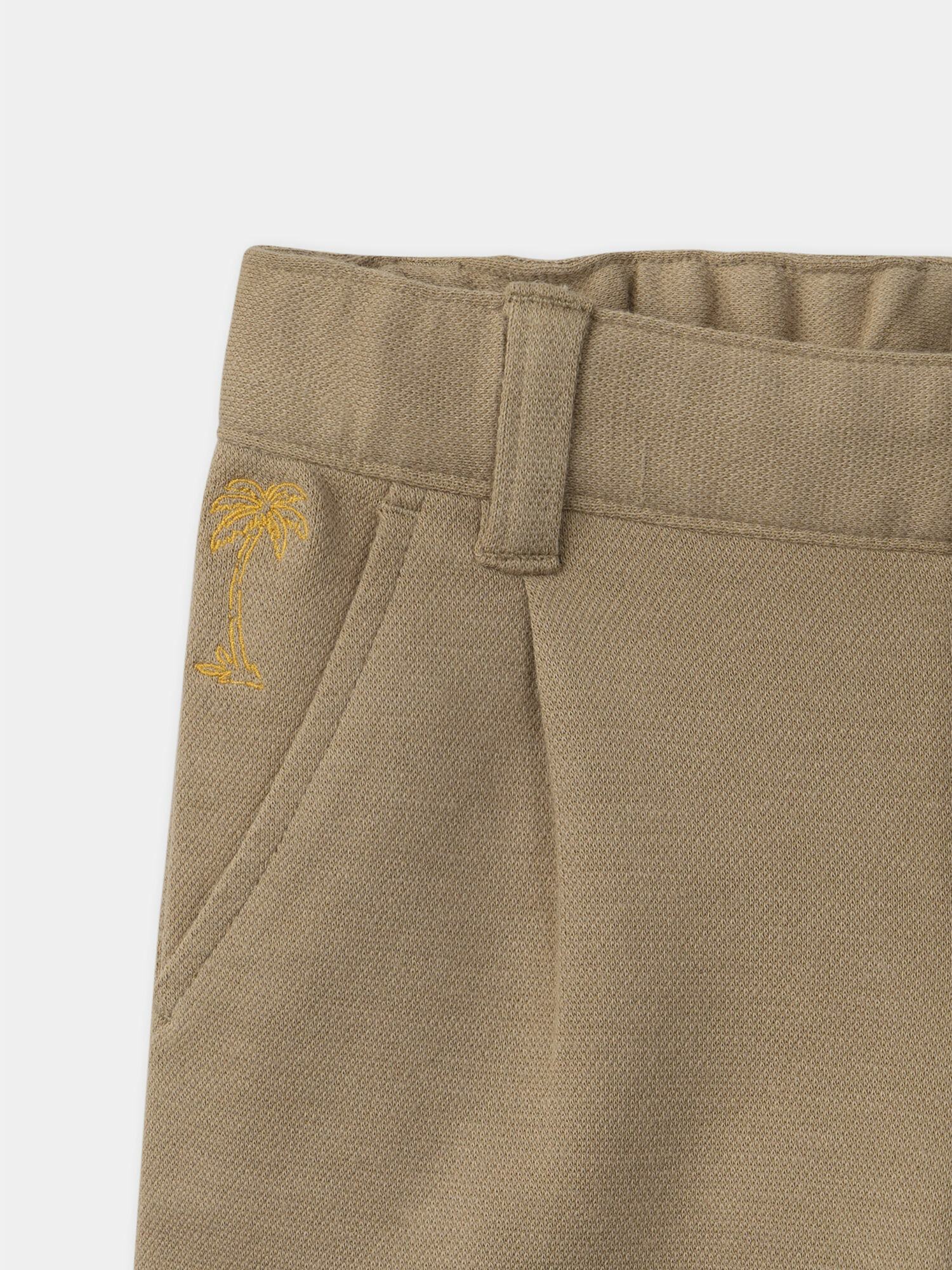 Conçu pour les enfants qui bougent librement, ce pantalon se distingue par sa taille élastiquée et ajustable, garantissant un maintien parfait tout au long de la journée. Les revers aux chevilles apportent une touche originale, tandis que la broderie palmier sur l’avant ajoute un détail tendance et estival. Pratique, il dispose de quatre poches, idéales pour garder petits trésors ou accessoires à portée de main.