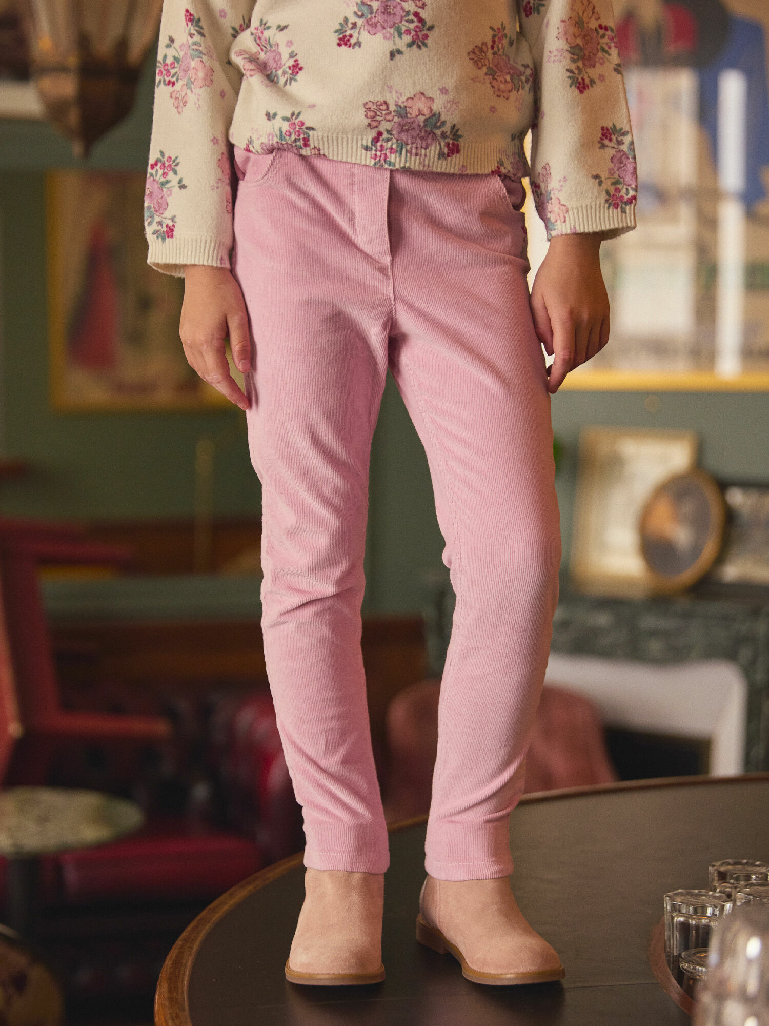 Pantalon en velours rose, Collection Meringue à Vienne T7. Mini volants à la taille, bouton décoratif, broderies fleurs en bas des poches. Deux poches devant, deux poches dos. Référence : LADOSETTE / 24H2PFQ1PAND329.