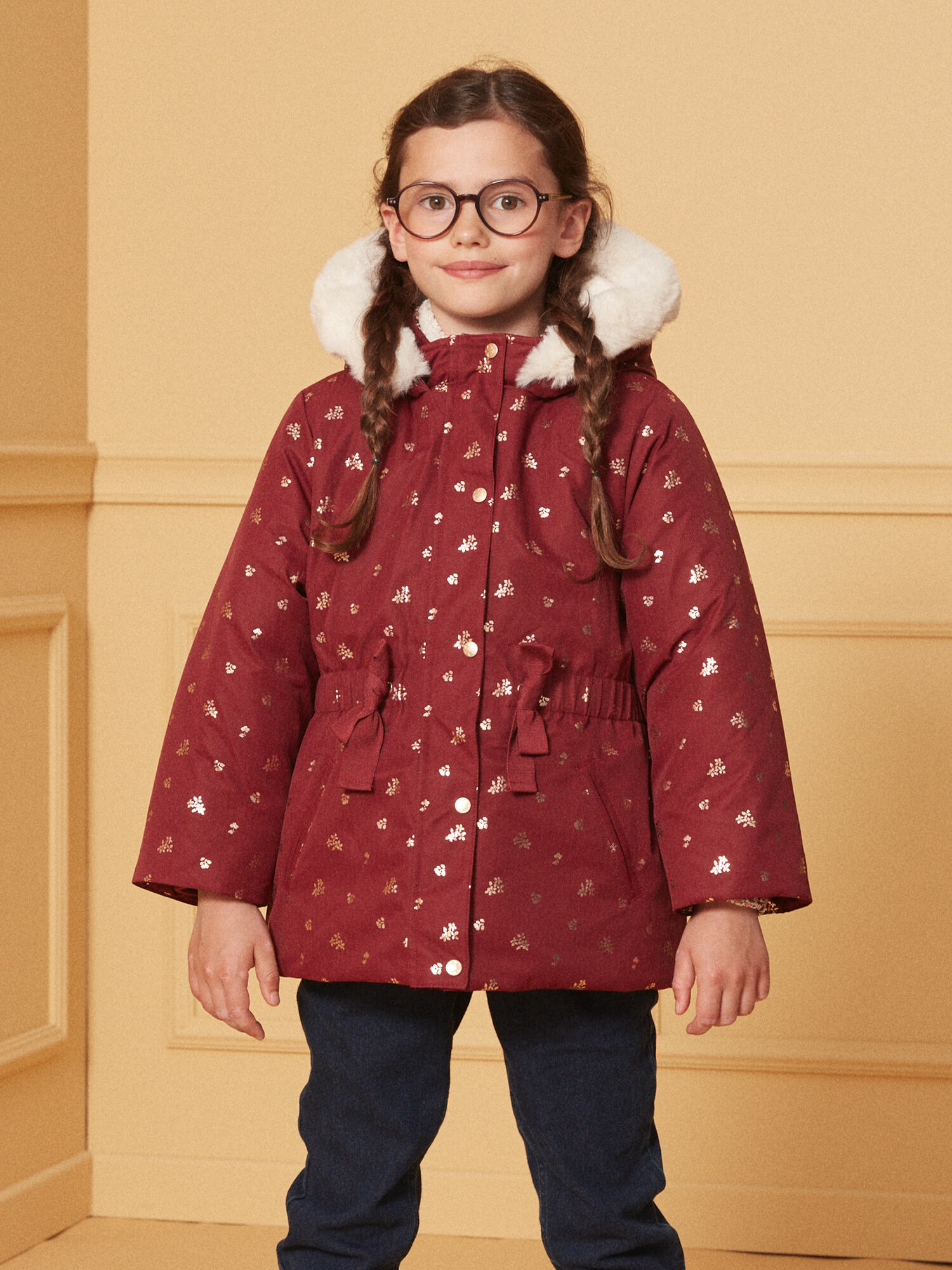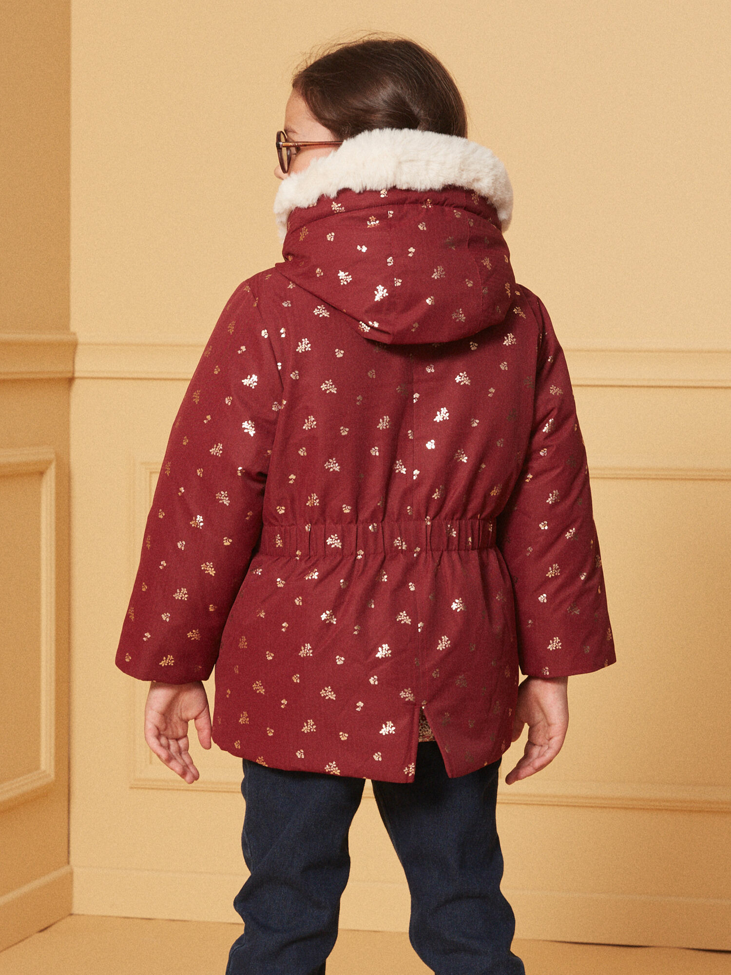 Matière chevron à motifs fleurs dorées sur fond bordeaux, fourrure synthétique amovible en bord de capuche, bord-côtes en bas des manches, deux poches passepoilées doublées polaire, veste intérieure réversible avec col montant, deux poches plaquées à boutons-pression, boucles aux poignets pour accrocher les gants. Déperlante et resserrée à la taille pour un ajustement parfait.