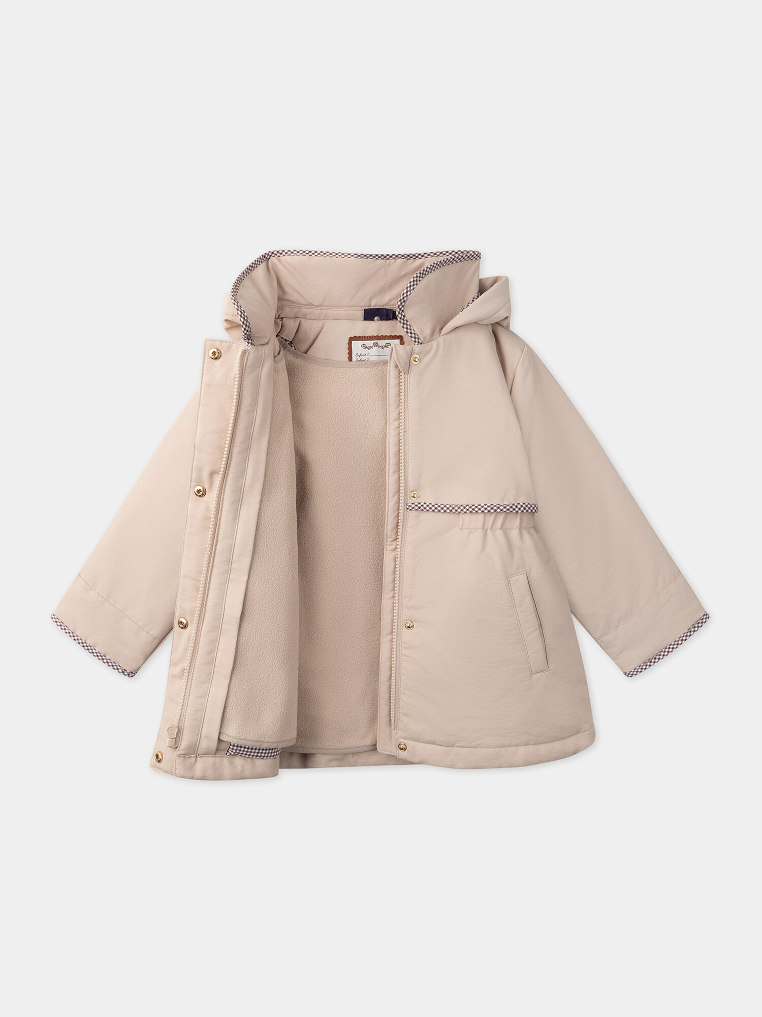 Matière déperlante, col claudine, bavolets sur le devant et au dos, deux poches passepoilées doublées polaire, doublure et détails extérieurs à carreaux, taille resserrée, doublure polaire amovible sans manches, boucles aux poignets pour accrocher les gants.