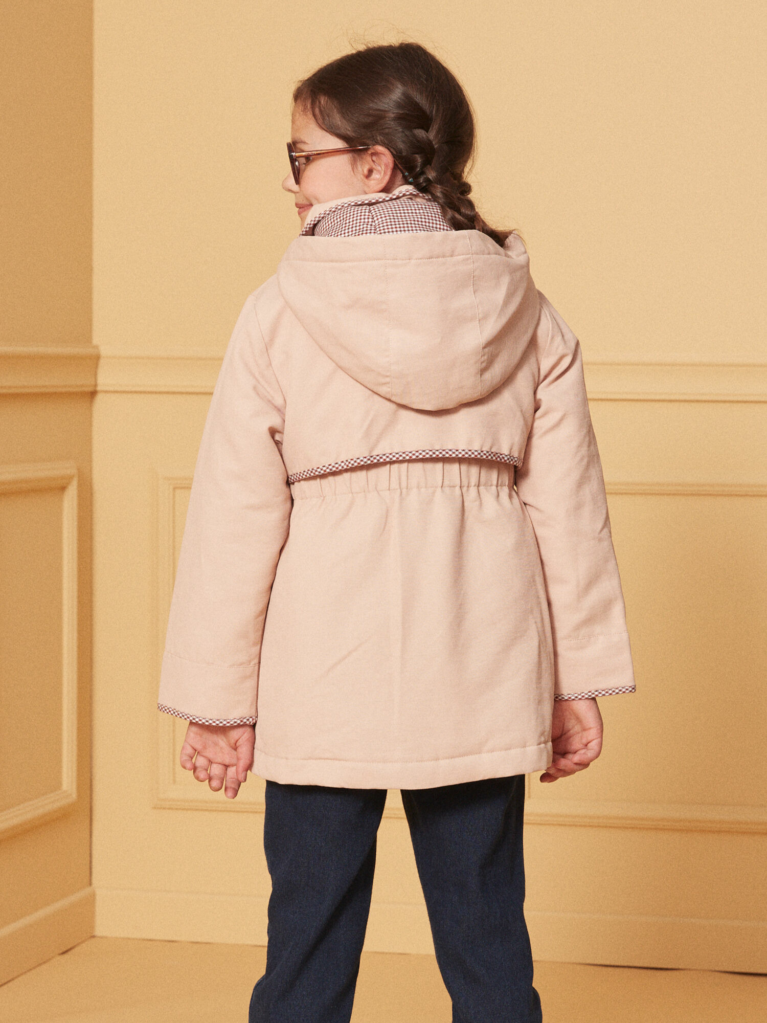 Conçue en matière déperlante, cette parka protège efficacement contre l’humidité tout en restant légère. Son col claudine et ses bavolets sur le devant et au dos apportent une touche raffinée, tandis que la doublure et les détails extérieurs à carreaux renforcent son charme classique. La capuche intégrée assure une protection supplémentaire lors des journées venteuses ou pluvieuses.