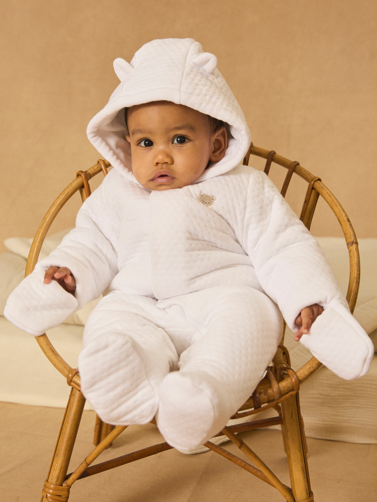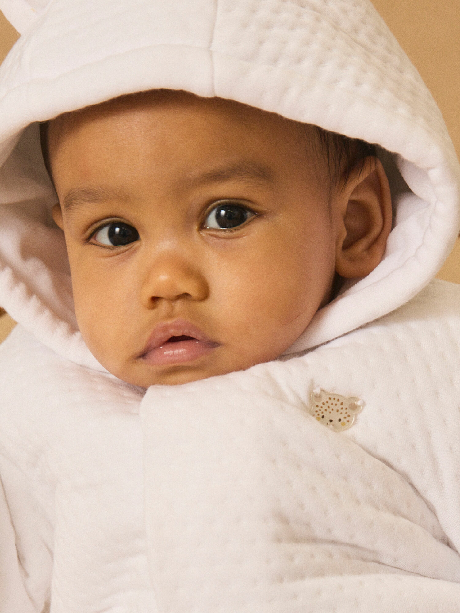 Référence MONDON / 25E0CM21PIL000, ce pilote appartient à la collection Naissance. Il est fabriqué en tubique ajouré avec une doublure en fourrure synthétique écrue. L’ouverture avant combine un zip et des boutons pression invisibles. La capuche est décorée d’oreilles d’animaux en 3D, et une plaquette léopard orne le buste. Retrouvez les informations environnementales détaillées en cliquant sur le lien dédié.
