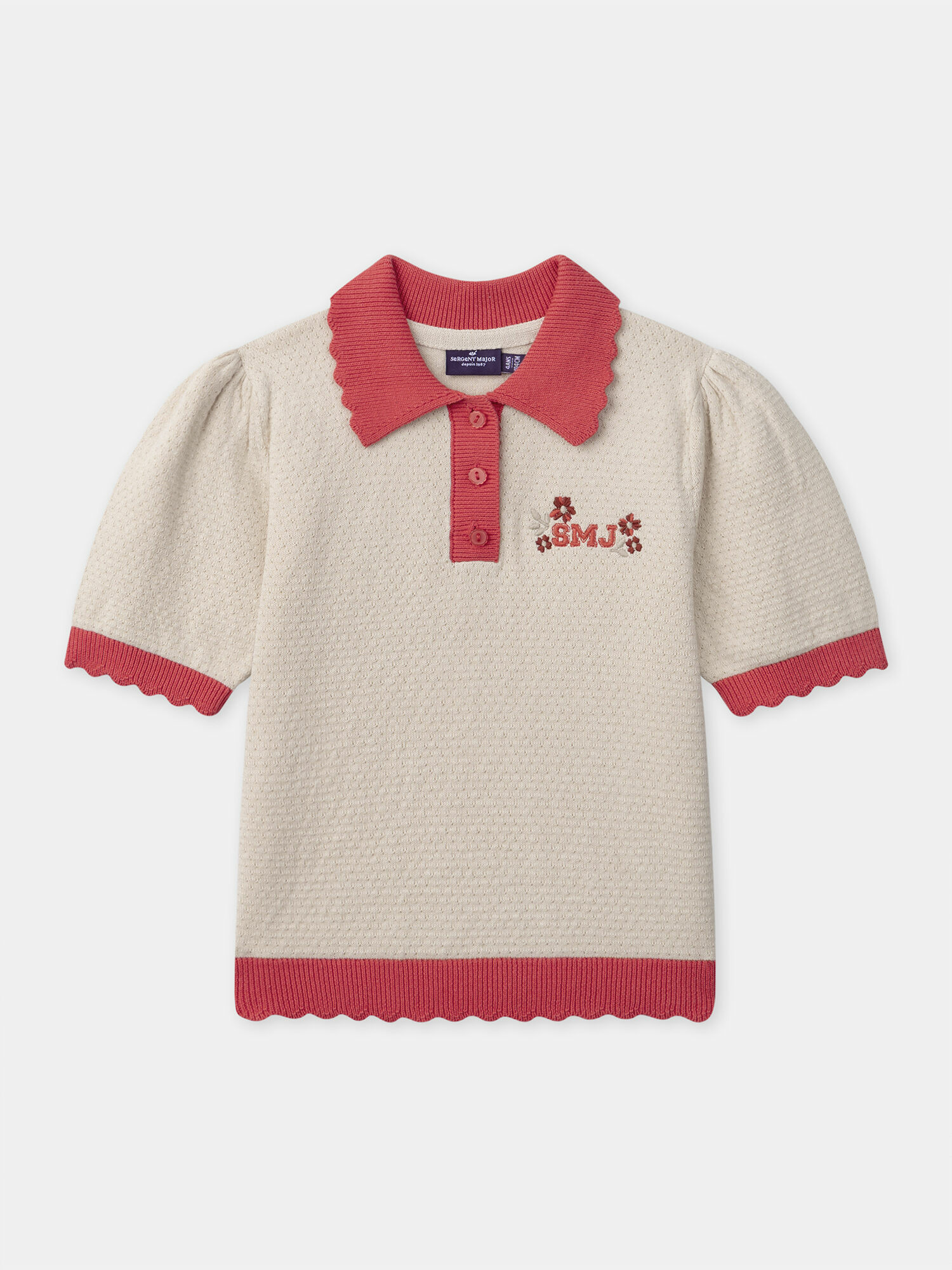 Maille ajourée légère, manches ballon, finition coquille aux manches, col et manches festonnés rouge corail, broderies SMJ, boutons sur le devant. Produit issu de la collection Balade Au Marché. Référence : NEPOUETTE / 25H2PFK1PSM801.