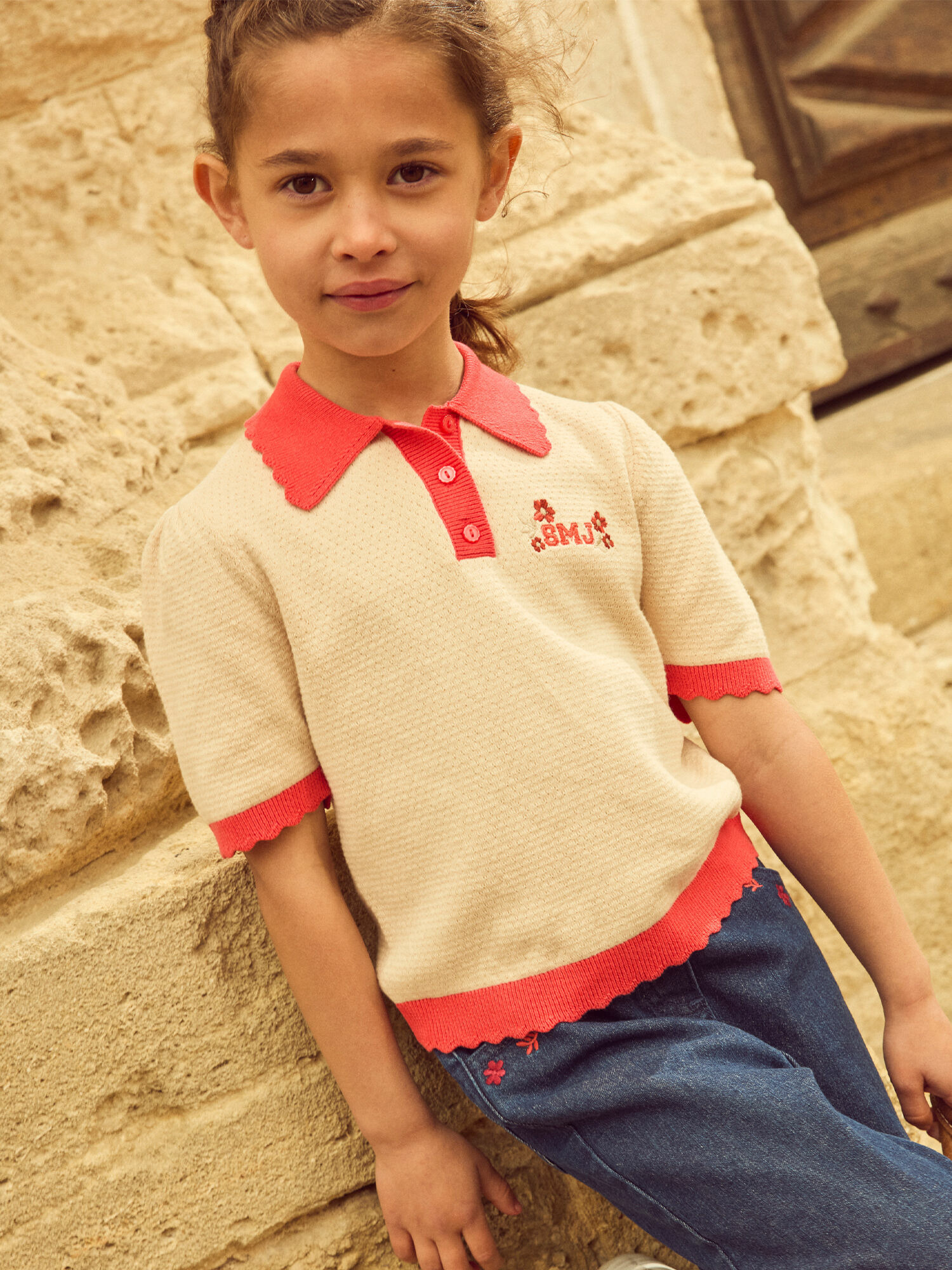 Confectionné en maille ajourée légère, ce polo écru offre un confort optimal lors des saisons douces. Ses manches ballon et son col festonné rouge corail soulignent une silhouette subtilement élégante, tandis que les broderies SMJ et les boutons sur le devant ajoutent un détail soigné et raffiné. Parfait pour accompagner les promenades printanières ou les journées ensoleillées, il s’intègre facilement dans une garde-robe chic et pratique.