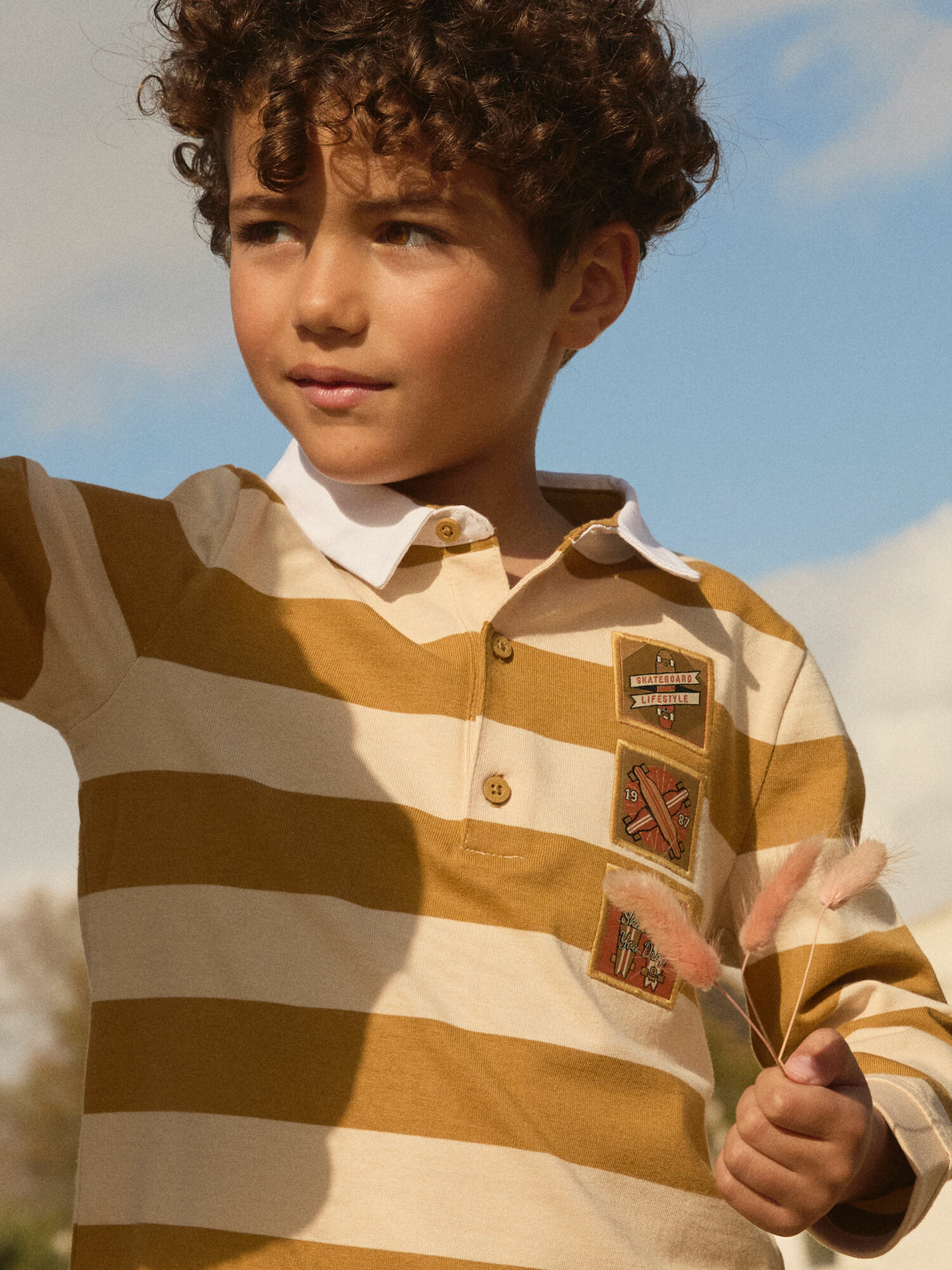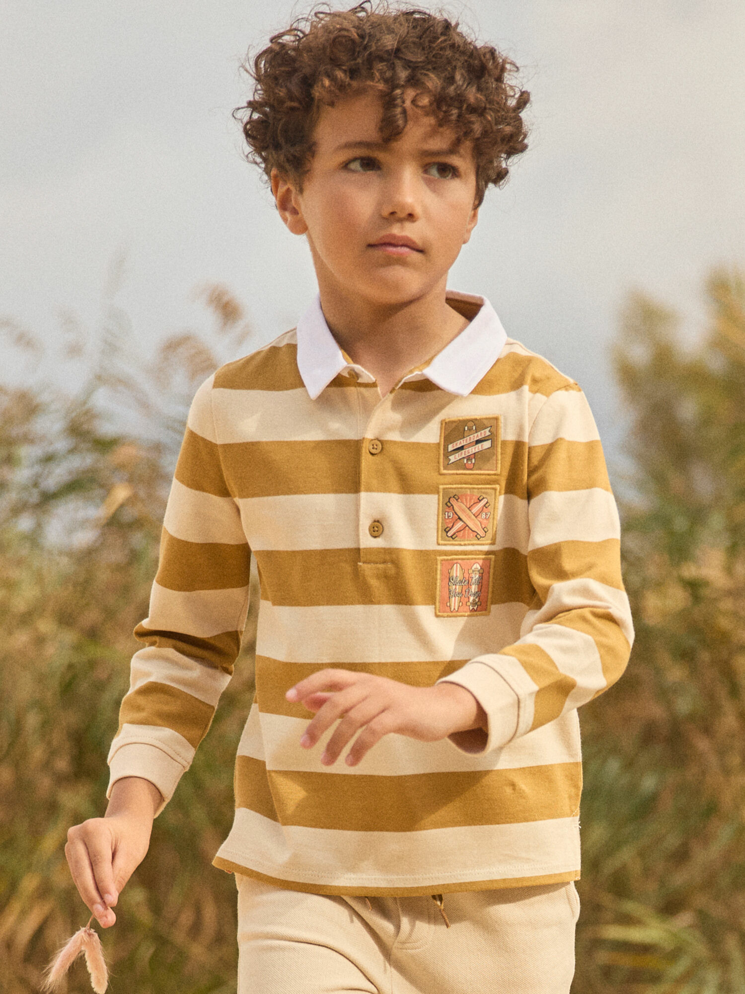 Polo en jersey à rayures vanille et camel. Trois étiquettes skateboard tissées et incrustées. Col contrasté blanc. Bord-côte aux poignets. Ouverture à trois boutons sur l’avant. Produit issu de la collection Terre de Chardons. Référence : MADOAGE / 25E3PG71POL812.