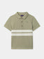 100% coton, maille piquée. Col polo classique avec patte de boutonnage. Manches courtes. Rayures horizontales écrues sur fond vert. Disponible en plusieurs tailles pour garçons.