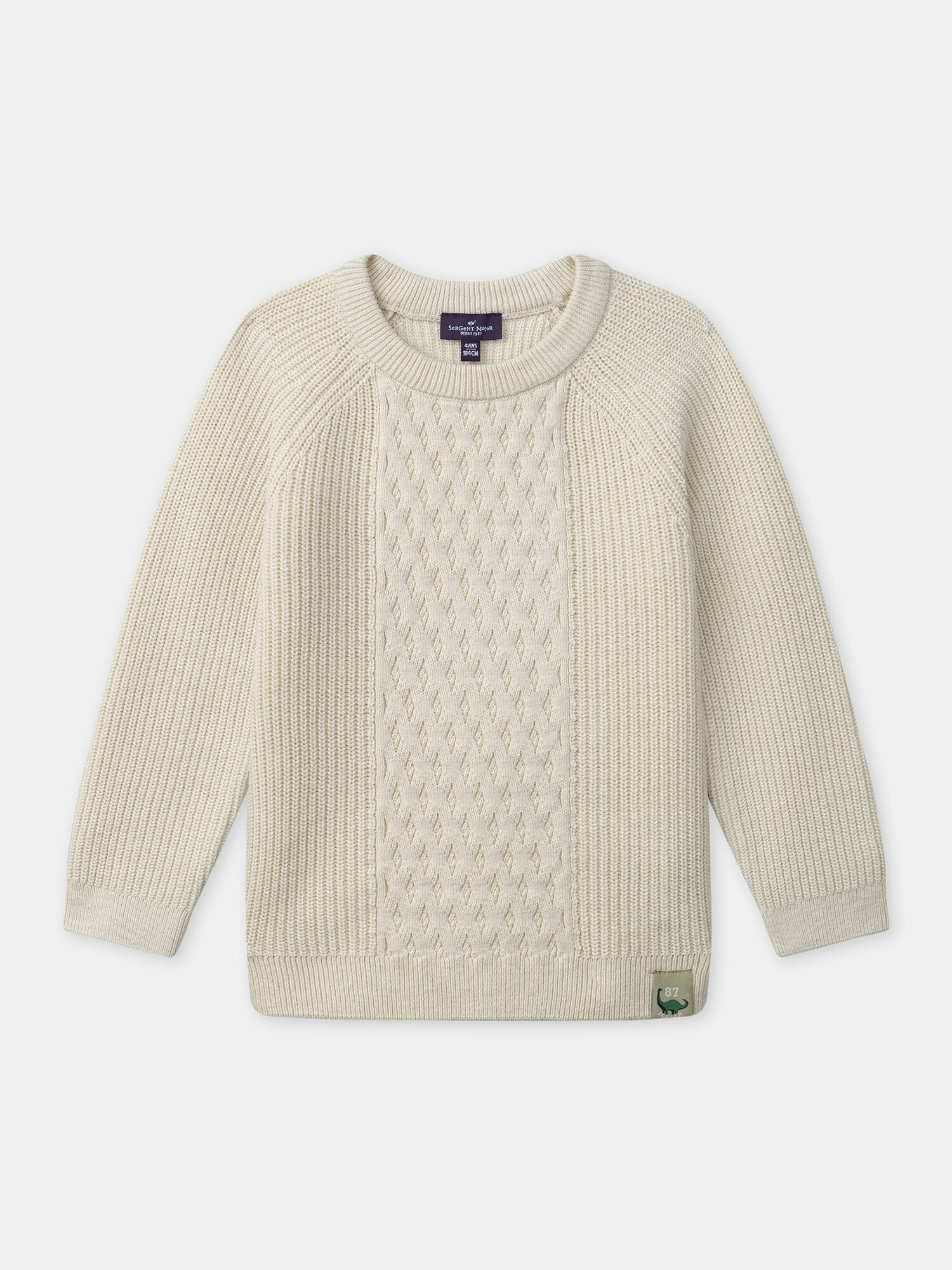 Conçu avec des manches raglan pour une liberté de mouvement optimale, ce pull séduit par son effet torsade délicat sur le devant, qui souligne un style intemporel. Les finitions en bord-côte au col, aux poignets et à la taille garantissent un maintien parfait tout en assurant douceur et chaleur. L’étiquette tissée discrète en bas du vêtement signe la qualité Sergent Major et une attention aux détails.