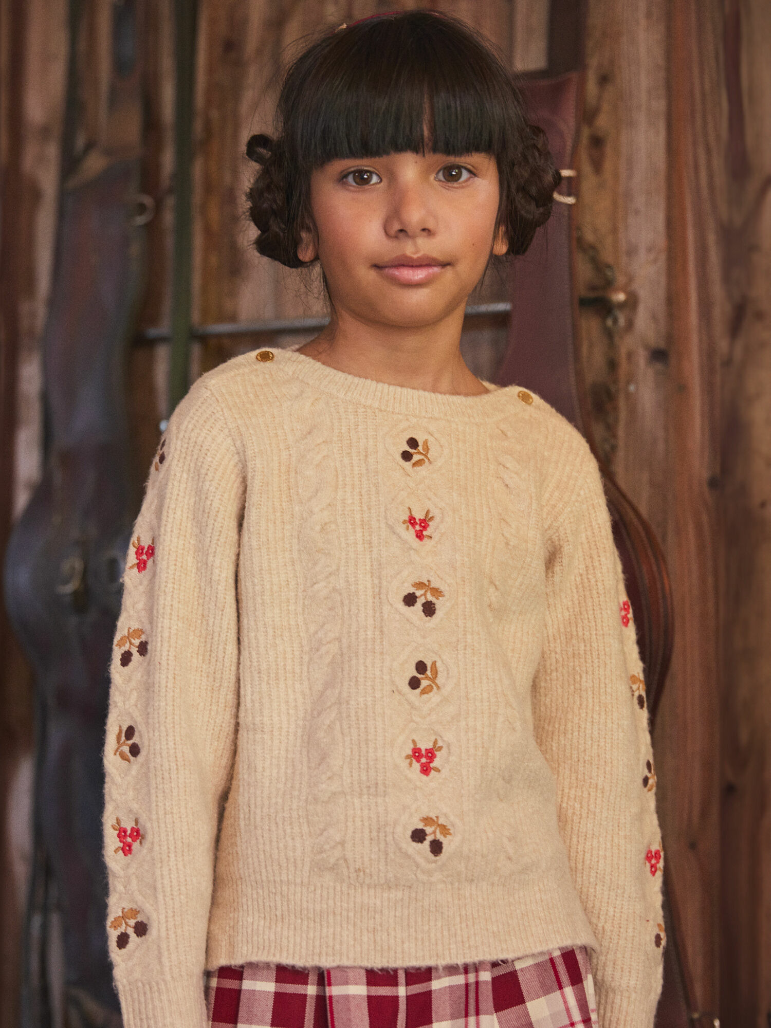 Maille torsadée brodée, bords-côtes à l’encolure, aux bas de manches et au bas du vêtement, petites fentes sur les côtés. Collection Fruit confit à Varsovie. Référence : LALOLETTE / 24H2PFR1PUL001.