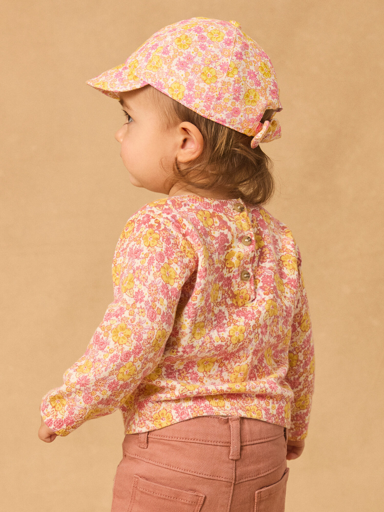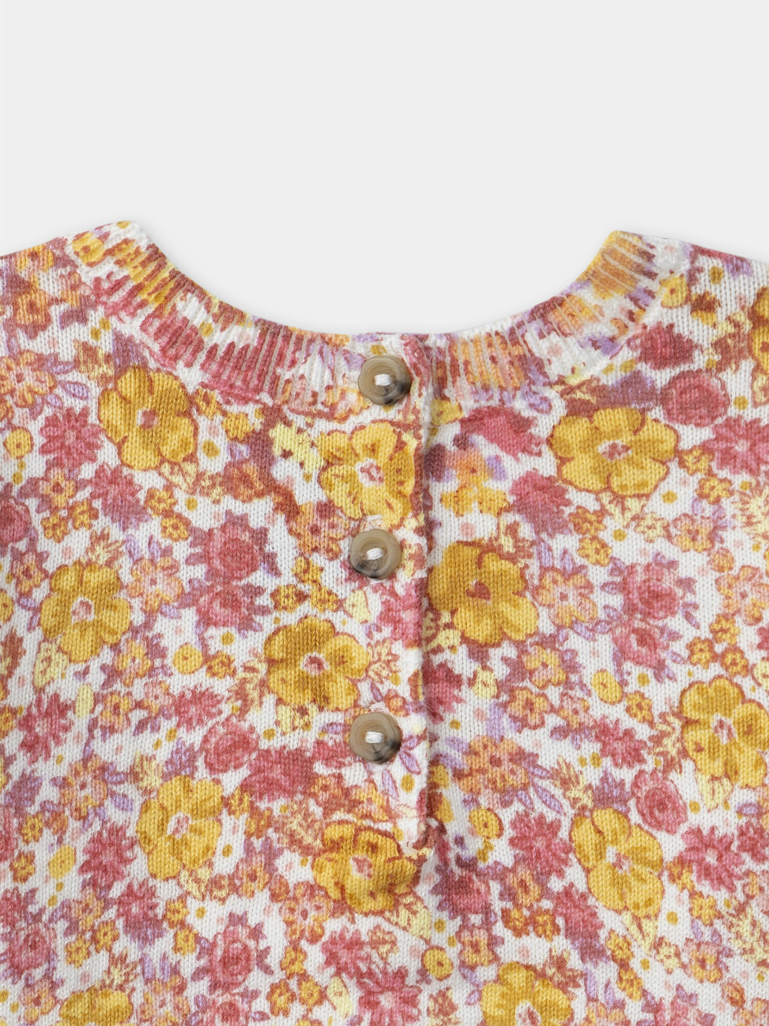 Confectionné dans des tons jaune, orange pâle, rose et lilas sur un fond écru, ce pull associe douceur visuelle et confort optimal. L’ouverture au dos, ornée de boutons en forme de fleurs, facilite l’habillage tout en ajoutant un détail raffiné qui fait la différence. Idéal pour les petites filles qui aiment allier style et praticité.