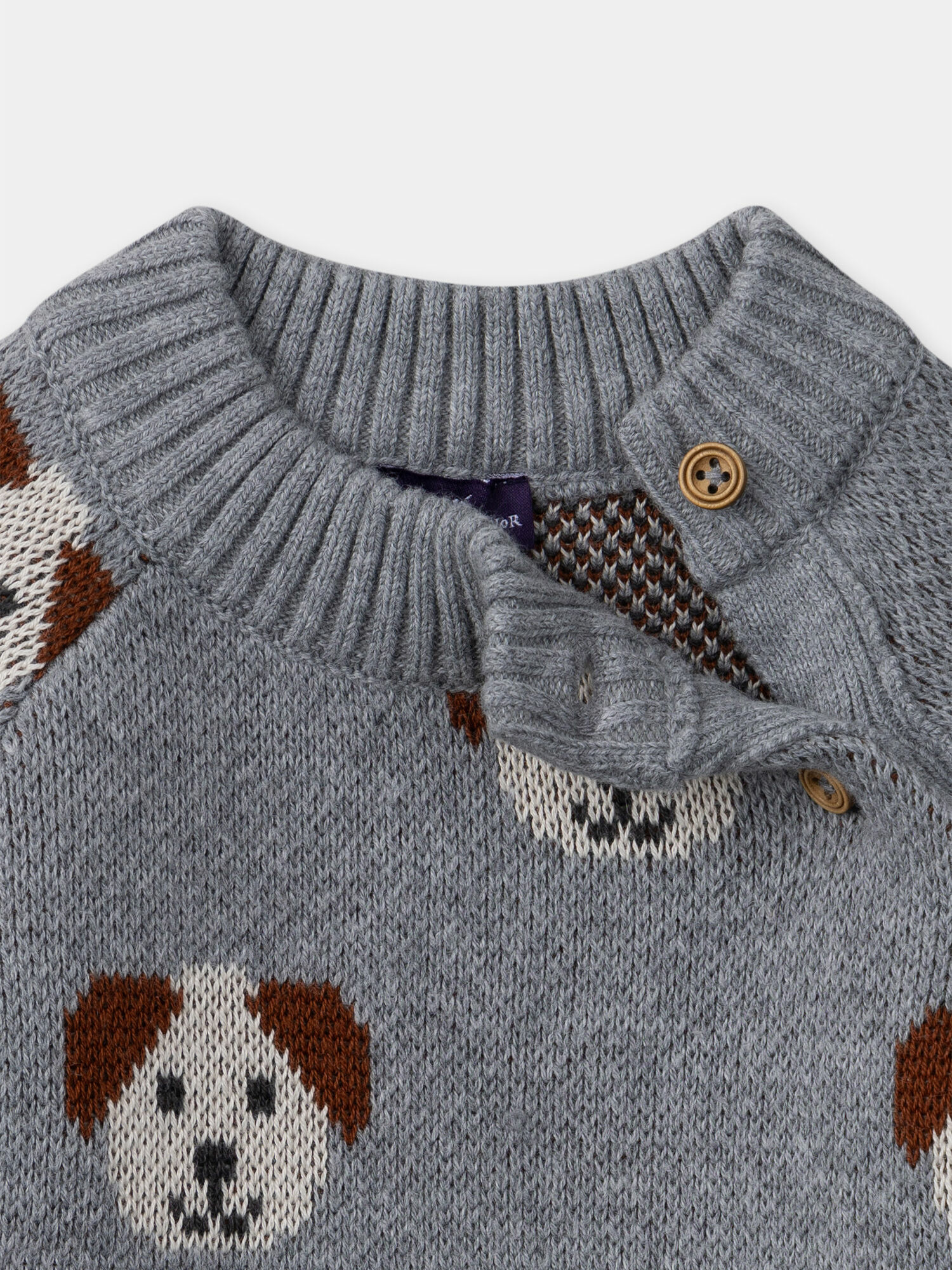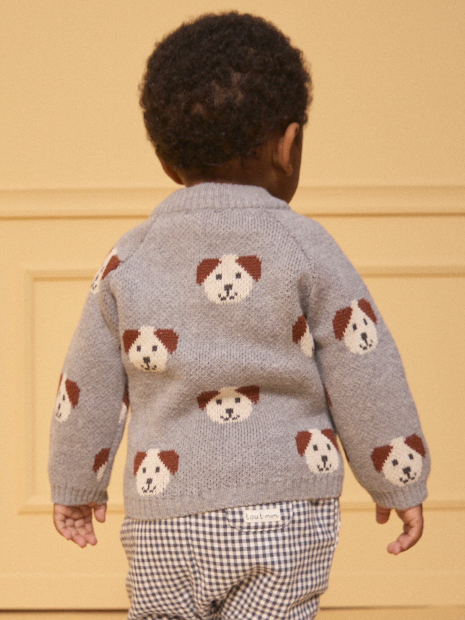 Apportez une touche ludique et chaleureuse à la garde-robe de votre enfant avec ce pull jacquard aux visages de chiens. Son design unique en tons beige et marron s’allie à un col montant pratique pour affronter les journées fraîches avec style.