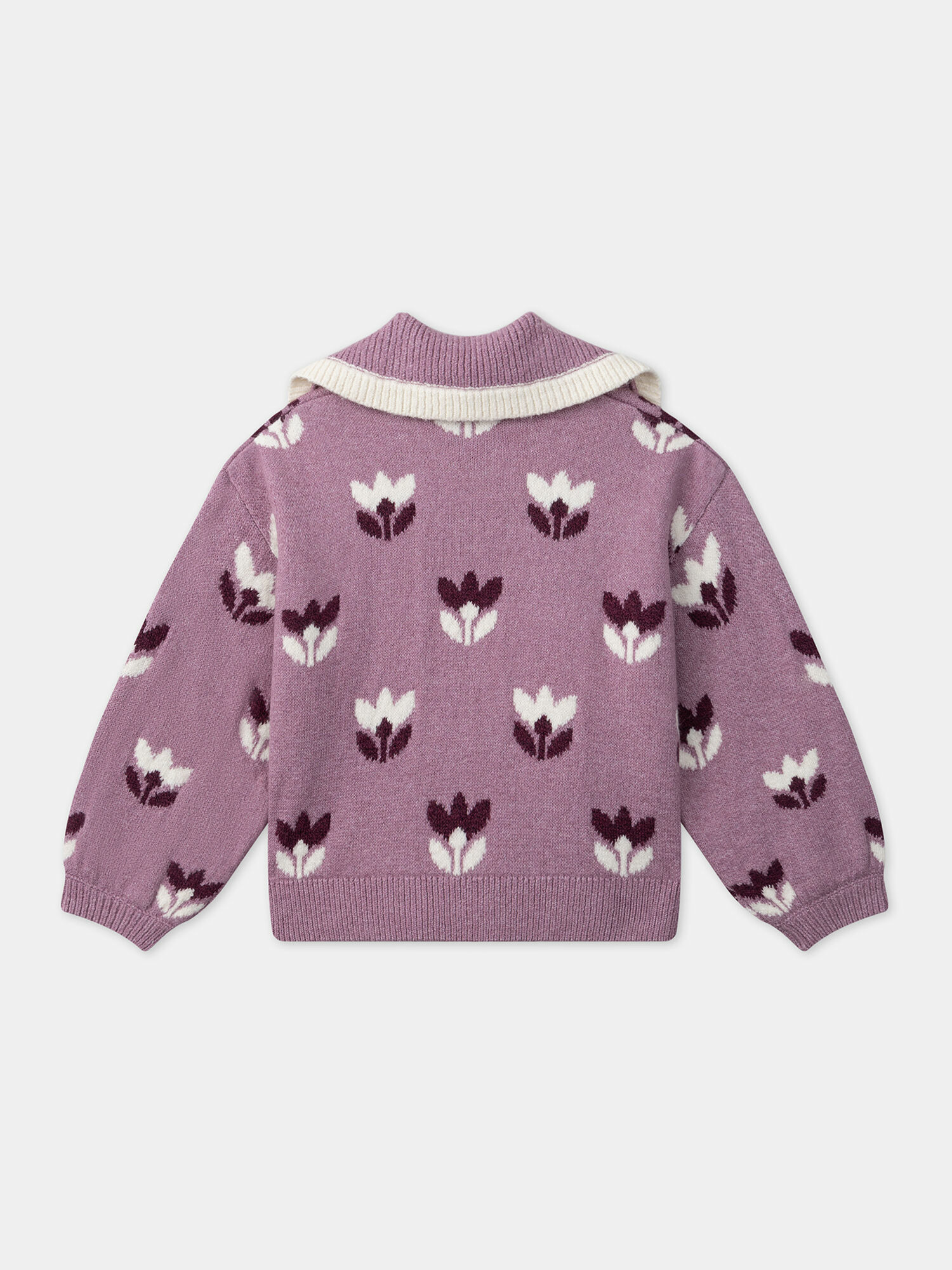 Pull violet à fleurs avec col claudine bicolore. Bord-côtes en bas de vêtement et aux bas de manches pour un maintien confortable. Produit issu de la Collection Chouquette à Paris, taille 5 ans. Référence : LUPULETTE / 24H2PFM1PUL320.