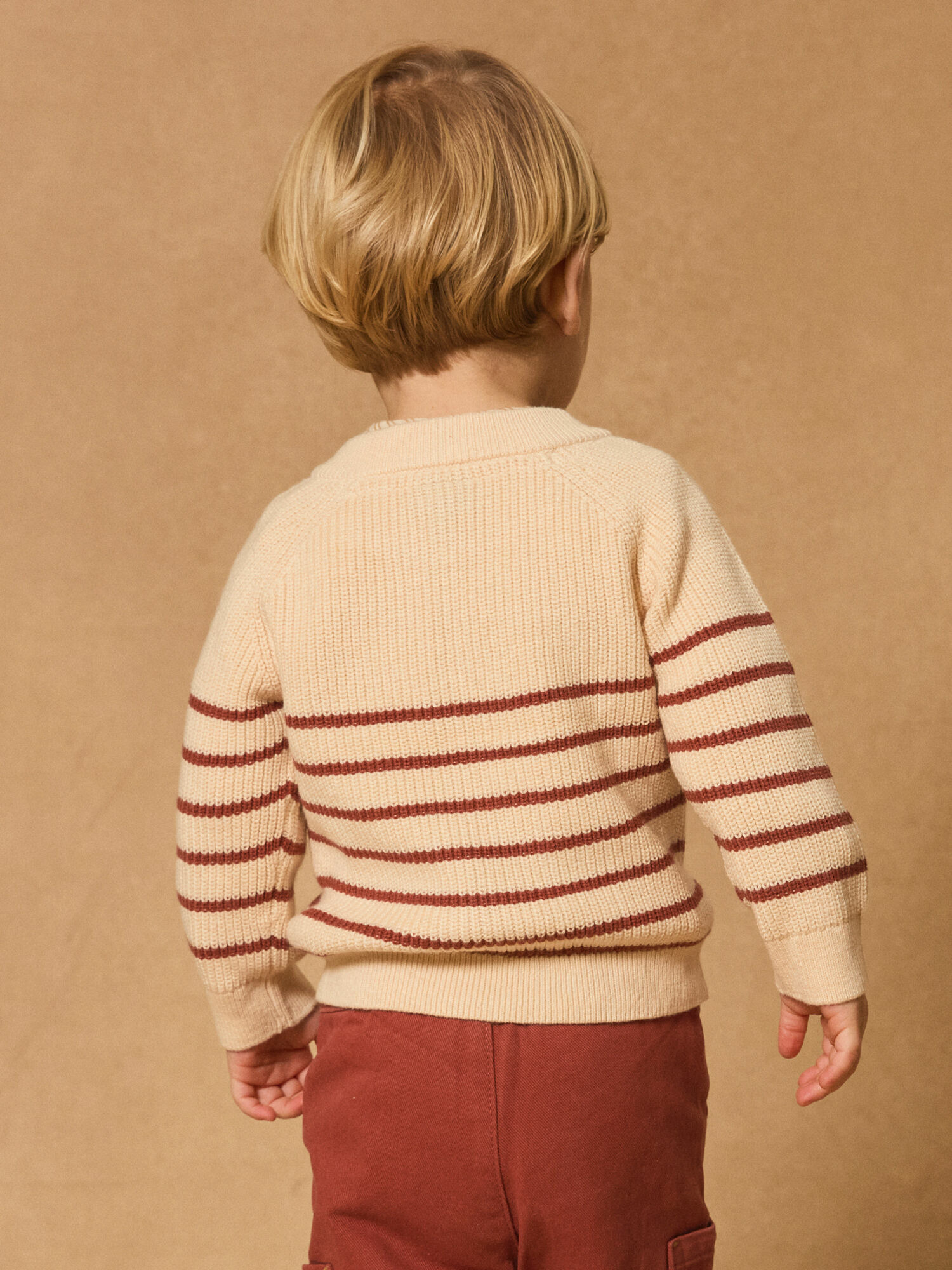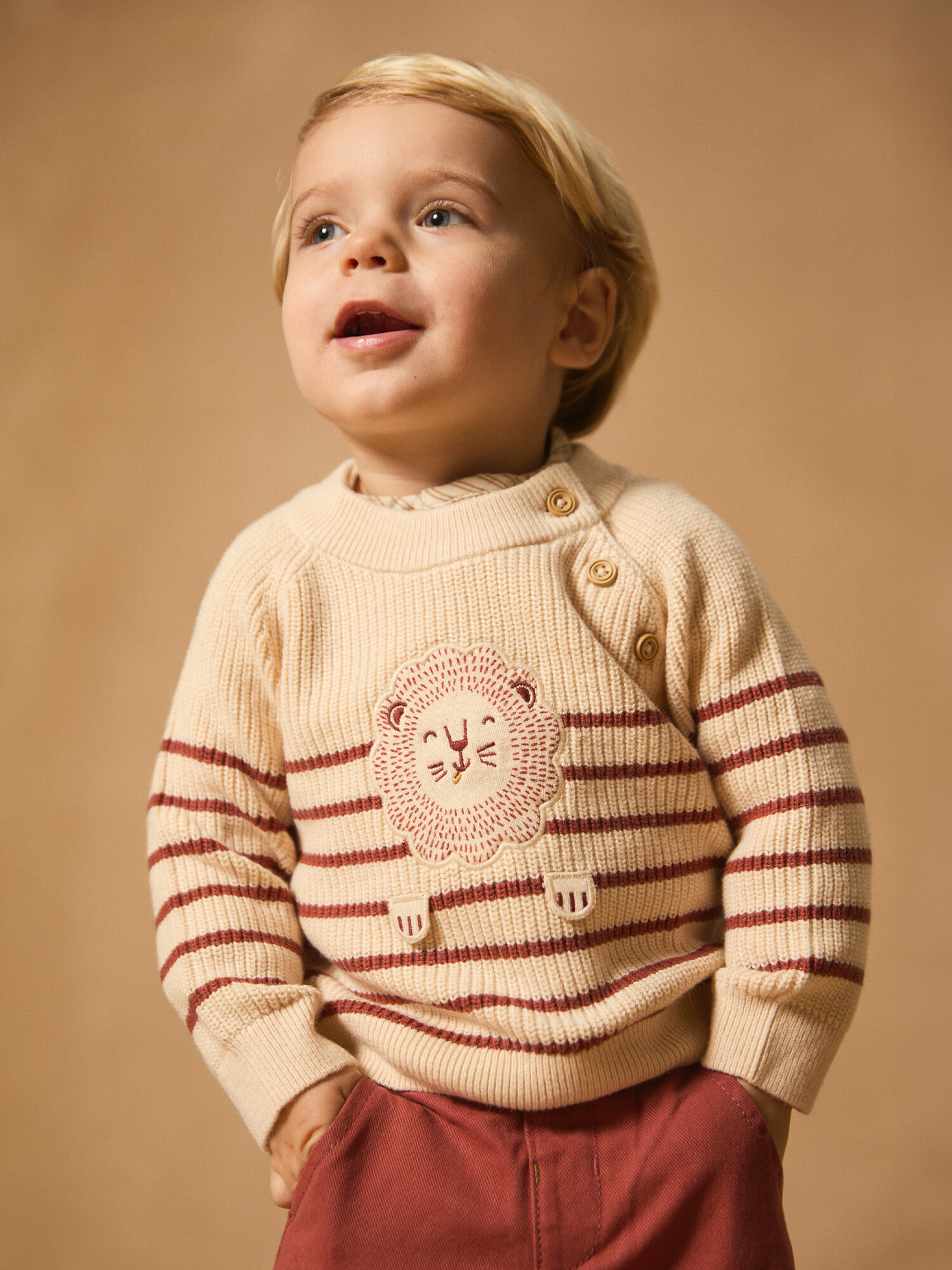 Pull rayé vanille et marron. Patch lion imprimé et brodé avec pattes en 3D. Ouverture col par boutons en bois. Référence : MAANTOINE / 25E1BG71PUL114. Ce produit appartient à la Terre de Chardons, un engagement pour des qualités et caractéristiques environnementales visibles via la fiche produit associée.