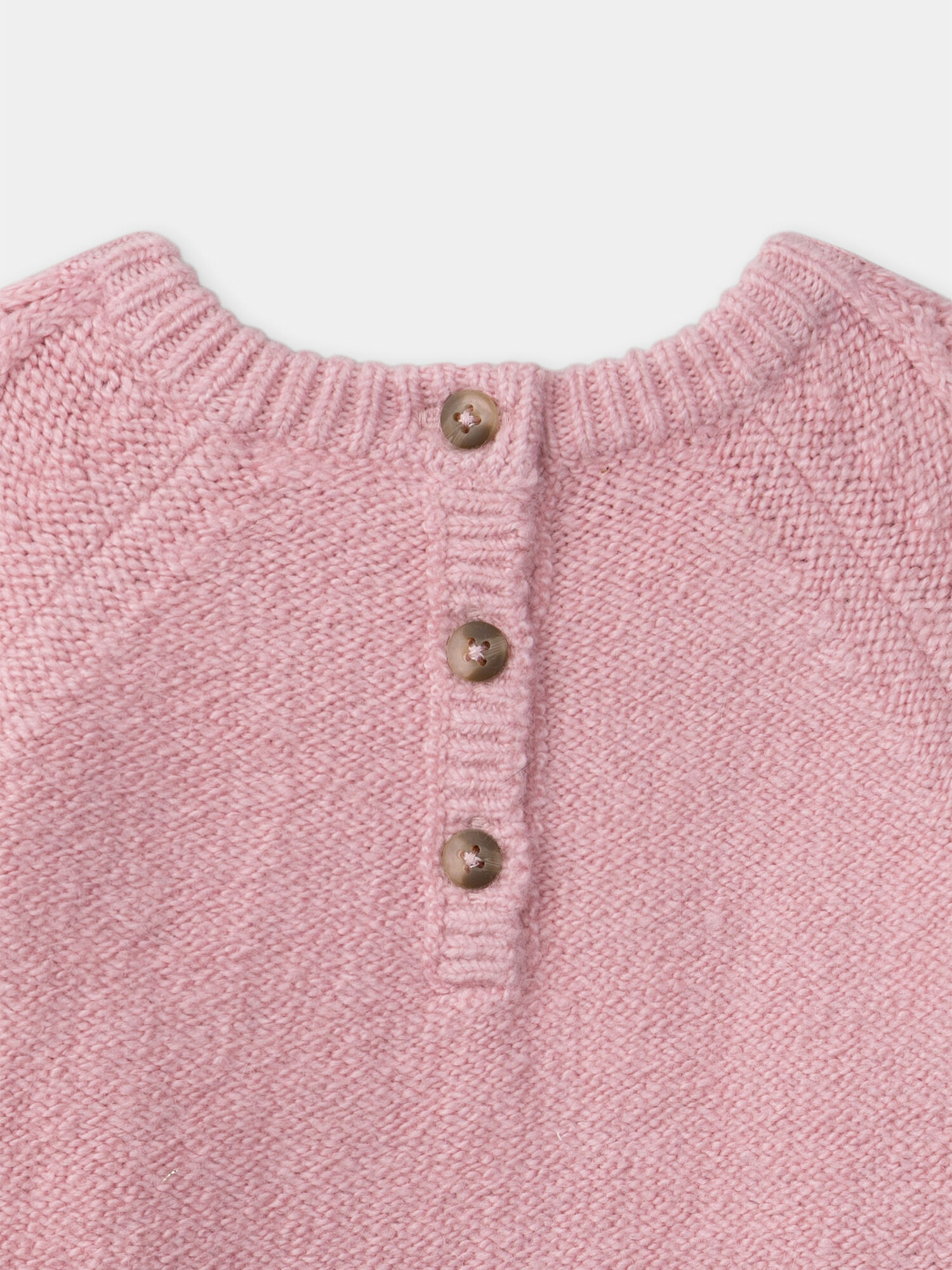 Pull torsadé rose pâle avec motifs fleurs roses sur manches et devant. Ouverture au dos avec boutons fantaisie pour un enfilage simplifié. Collection Meringue à Vienne T7. Référence : LANINA / 24H1BFQ1PULD329.