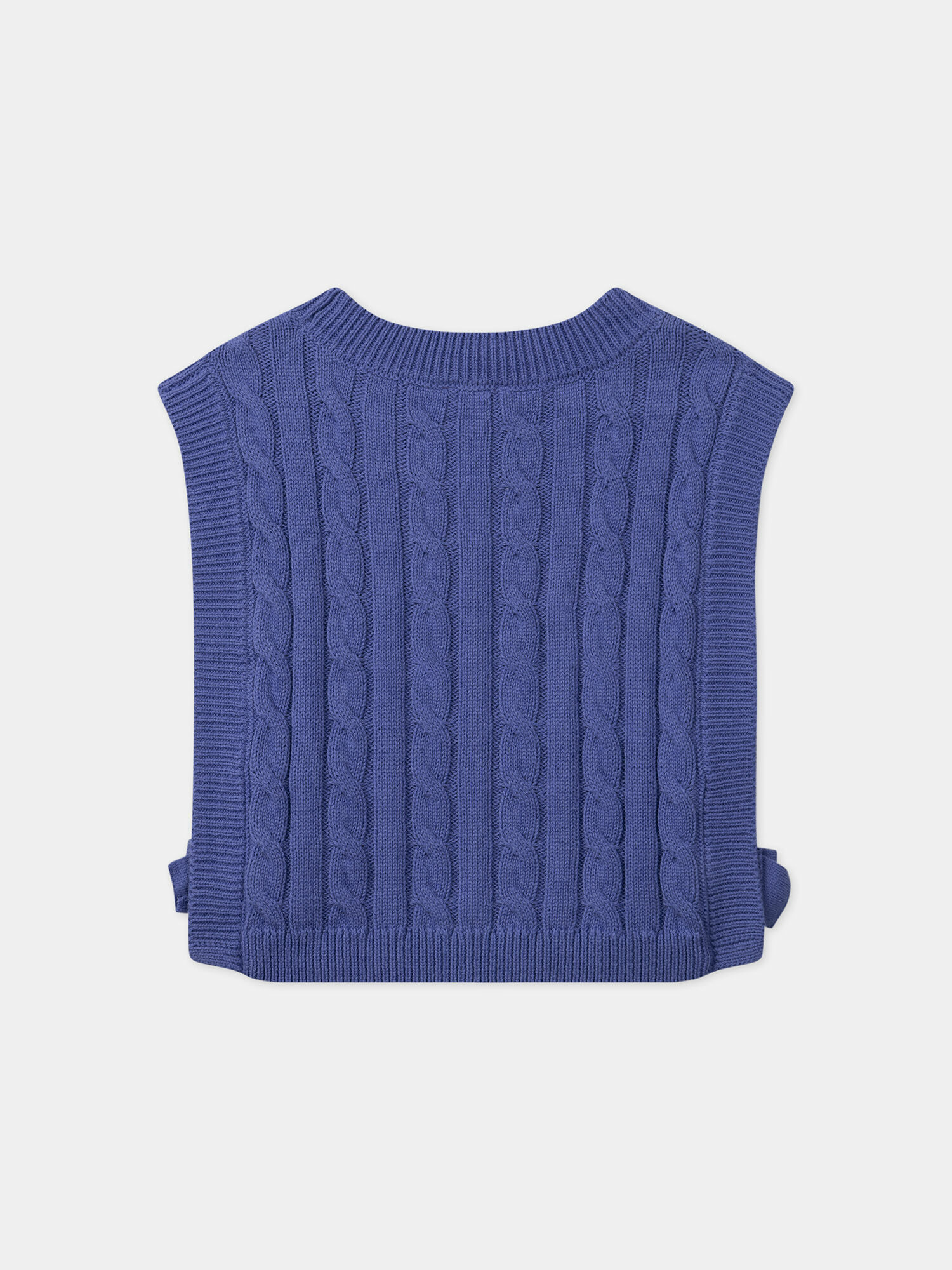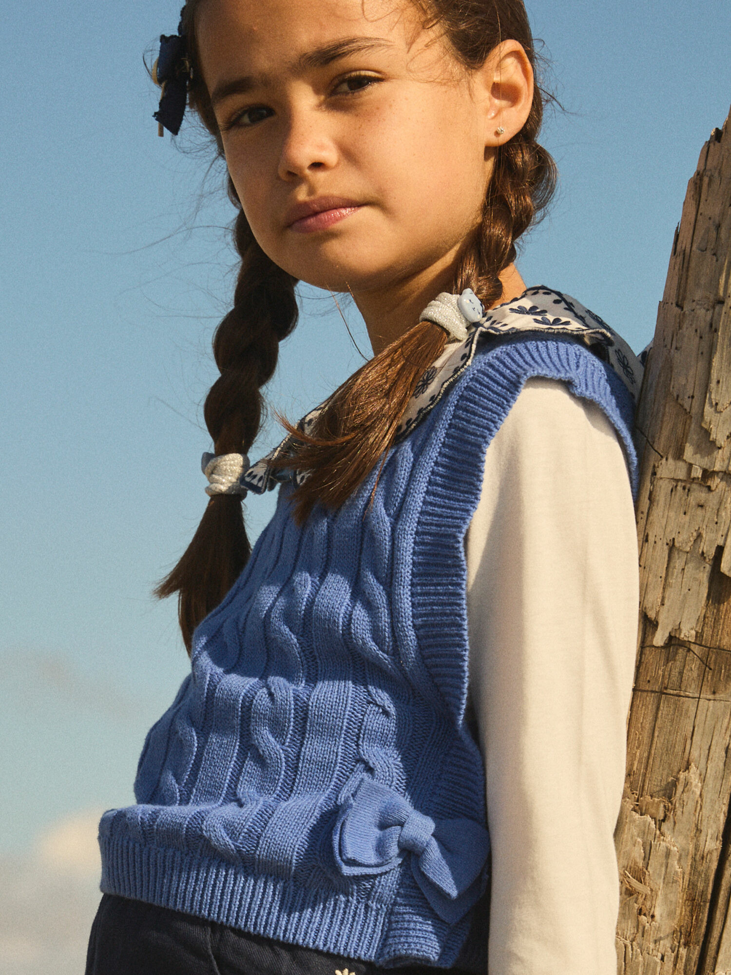 Pull en maille torsadée sans manches, orné de nœuds sur les côtés. Disponible dans la collection Bleu de Bleuets. Référence : MERSADETTE / 25E2PF81CSMC238. Pour plus d’informations sur ses qualités environnementales, consultez la fiche produit dédiée.